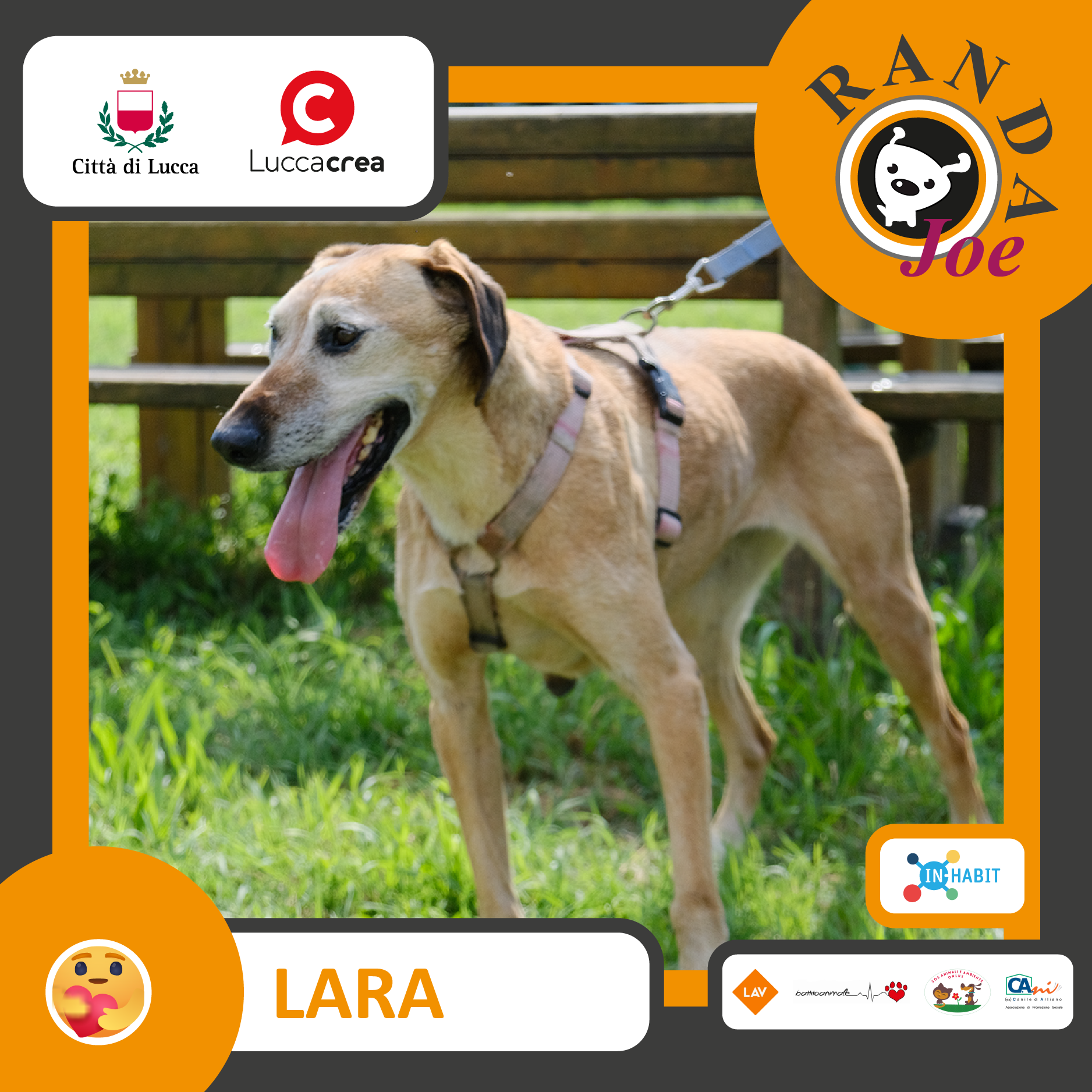 “Randa Joe - Concorso fotografico per quadrupedi senza casa” è un progetto del Comune di Lucca - in collaborazione con Lucca Crea, In-Habit Lucca e le associazioni Lav Lucca, Battito Animale, Sos Animali e Ambiente Onlus, Ass.Ca.Ni. - che si prefigge di sensibilizzare l’opinione pubblica sul tema delle adozioni canine e combattere la pratica degli abbandoni nel periodo estivo, ponendo tale problema sotto i riflettori dei massmedia. Tutti i cittadini possono votare, il regolamento è disponibile sulla pagina Facebook “Randa Joe”.
