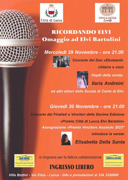 Grazie al patrocinio ed il contributo del comune di Lucca e Vivi Lucca events, mercoledì 29 e giovedì 30 novembre alle ore 21, a Villa Bottini, si terrà "Ricordando Elvi", due serate musicali in memoria dell'amica Elvi Bartolini, pianista e docente di canto lucchese, prematuramente scomparsa.