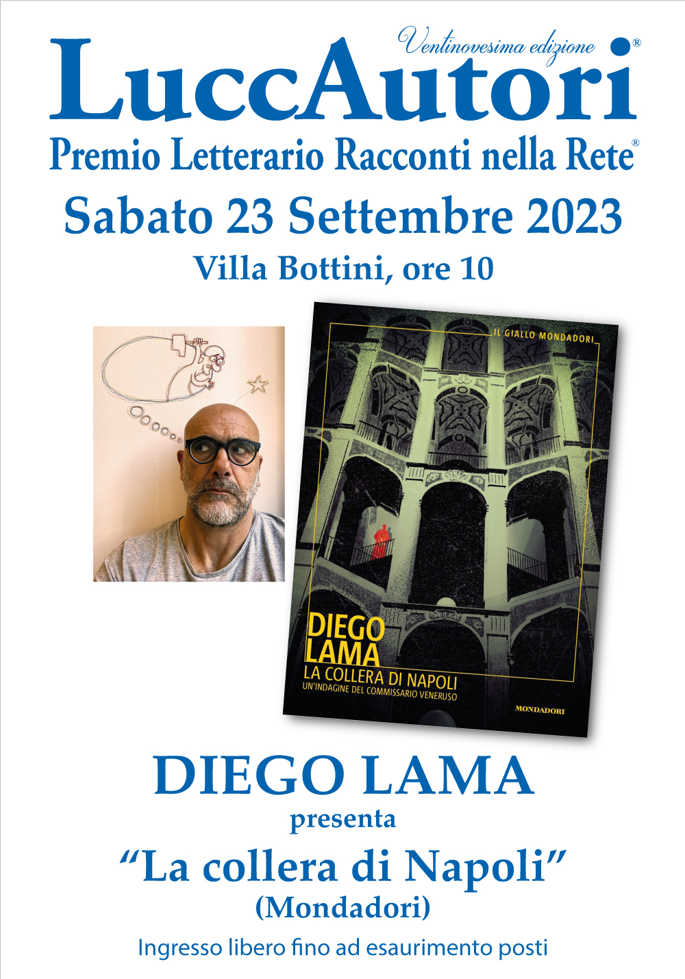 Sabato 23 settembre alle 10 a Villa Bottini lo scrittore Diego Lama presenta il romanzo "La collera di Napoli. Un'indagine del commissario Veneruso" (Mondadori). Diego ha scritto numerosi libri di successo con Mondadori, con protagonista il commissario Veneruso, ma non dimentica di essere stato tra i vincitori del premio Racconti nella Rete.