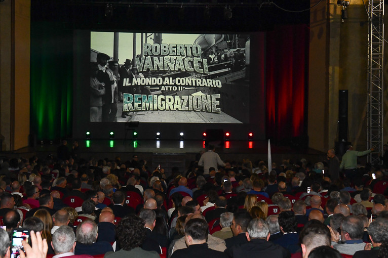 E dove il protagonista assoluto era lui, Roberto Vannacci con una lunga analisi sulla remigrazione e sui contenuti salienti della sua idea di Italia. Successo assoluto, condivisione di tutto da parte di un pubblico silenzioso e attento. Silenzio rotto costantemente da applausi scrocianti ad ogni conclusione dei vari atti, se così li possiamo definire, monologhi alternati con immagini valoriali come quella della famiglia, di un padre anziano che abbraccia un figlio oltre che quelle a lui conosciute ovvero i lanci di paracadutisti nel vuoto.