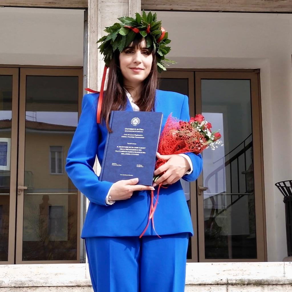La ritroviamo oggi, mese di aprile del 2022, neolaureata con 108 su 110 al corso di laurea in Chimica e Tecnologie farmaceutiche. Proprio un paio di giorni fa ha discusso la sua tesi 'Il recettore MC1R come target nella prevenzione e nel trattamento farmacologico del melanoma cutaneo'. Relatrice la professoressa Paola Nieri.