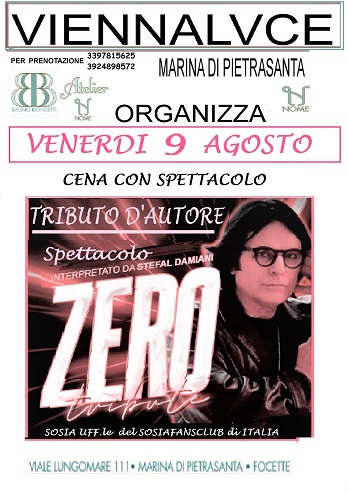 Si prospetta un’altra grande serata al Bagno Biondetti-Vienna Lvce: questo venerdì 9 agosto il locale ospiterà una cena accompagnata dallo spettacolo “Zero Tribute”, un tributo al grande cantautore Renato Zero interpretato da Stefal Damiani.