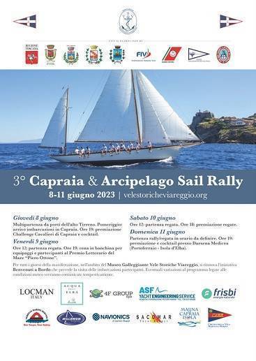 Questo in sintesi il 3° Capraia e Arcipelago Sail Rally (iscrizioni a questo link https://velestoricheviareggio.org/iscrizione-capraia-sail-rally/), in programma dall'8 all'11 giugno 2023, organizzato dall'Associazione Vele Storiche Viareggio con il supporto della Guardia Costiera. Le imbarcazioni iscrittre ad oggi sono 25, suddivise nelle categorie 'Epoca', 'Classiche' e 'Vele Storiche'. Quest'ultimo raggruppamento, secondo la definizione dell'Associazione Vele Storiche Viareggio, consentirà loro di correre in tempo reale senza l'obbligo di presentare un Certificato di Stazza CIM in corso di validità. Come accade già da diversi anni, il Consorzio Lamma Meteo fornirà a tutti i partecipanti le previsioni di vento e mare per ogni giornata. Il Capraia e Arcipelago Sail Rally è patrocinato dalla Regione Toscana, Provincia di Livorno, Comune di Capraia Isola oggi presieduto dal nuovo sindaco Lorenzo Renzi, Comune di Portoferraio, Nobile Ordine Cavalieri di Capraia, FIV, AIVE, Guardia Costiera.