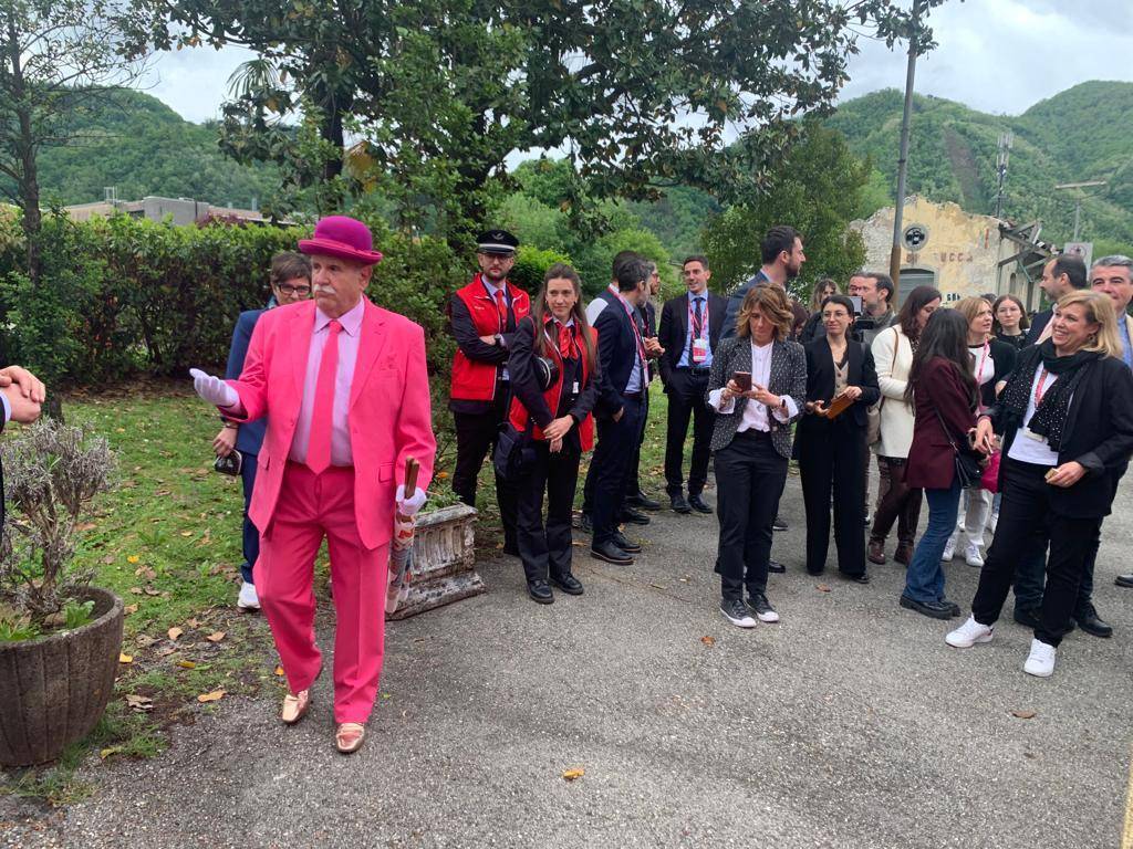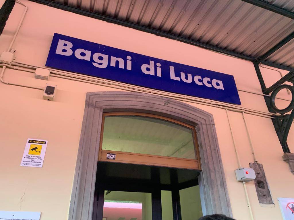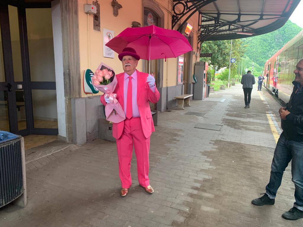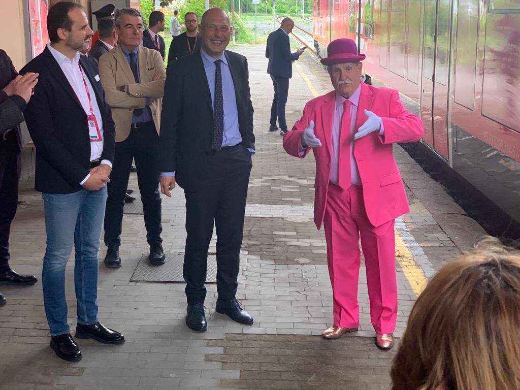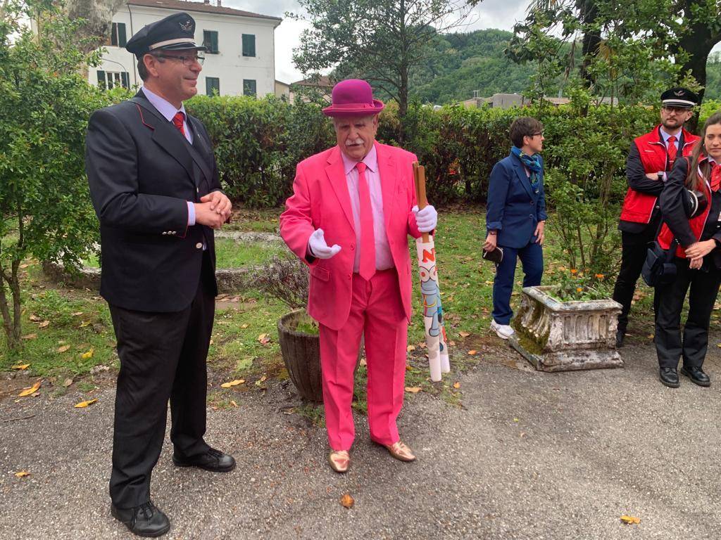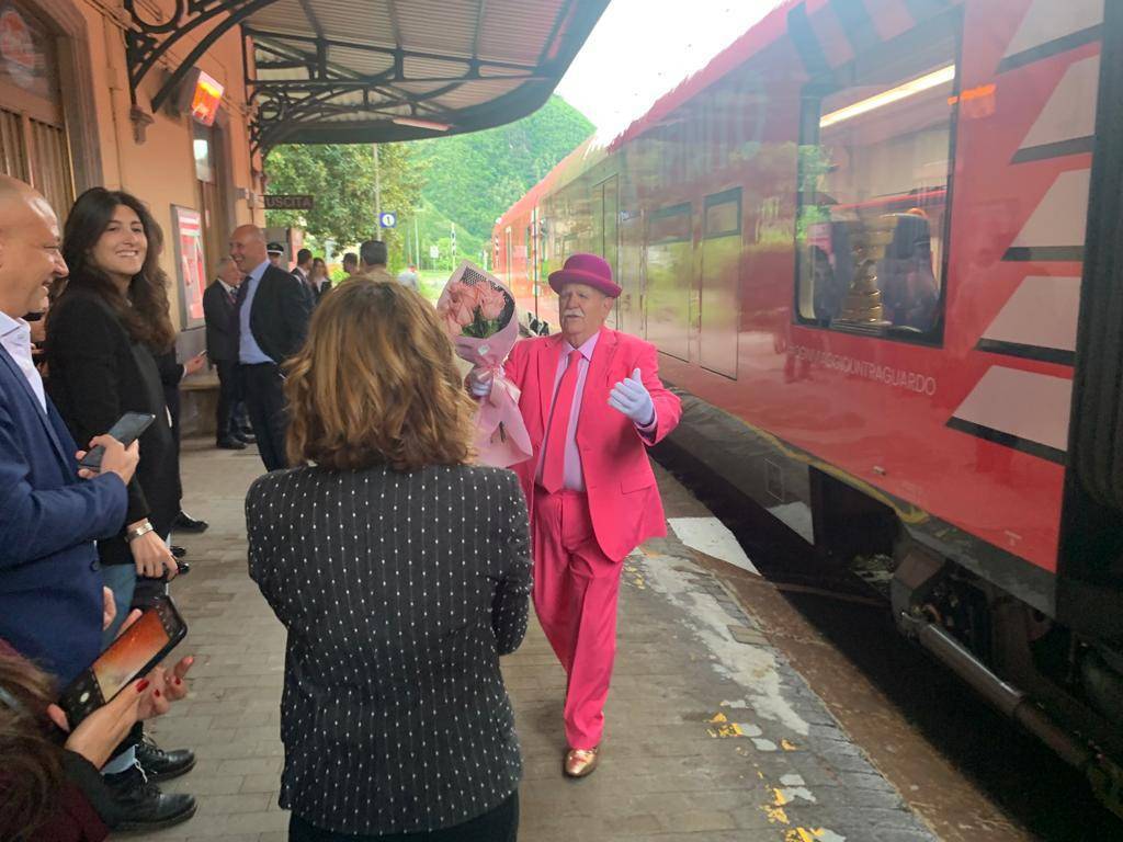 Partenza alle ore 14.35 da Lucca fino con arrivo nella stazione di Bagni di Lucca, attendendo la vera carovana che proveniva dalla Valle del Serchio. Un’attesa rallegrata dall’inaspettato personaggio che ci ha accolto all’arrivo alla stazione del treno Swing con una livrea rosa. Anche l’allegro signore, rigorosamente in rosa con in mano un mazzo di rose intonate al vestito, ha voluto sottolineare con simpatia l’importanza dell’evento e, qualora qualcuno non l’avesse capito dall’abito, la sua passione per il ciclismo.