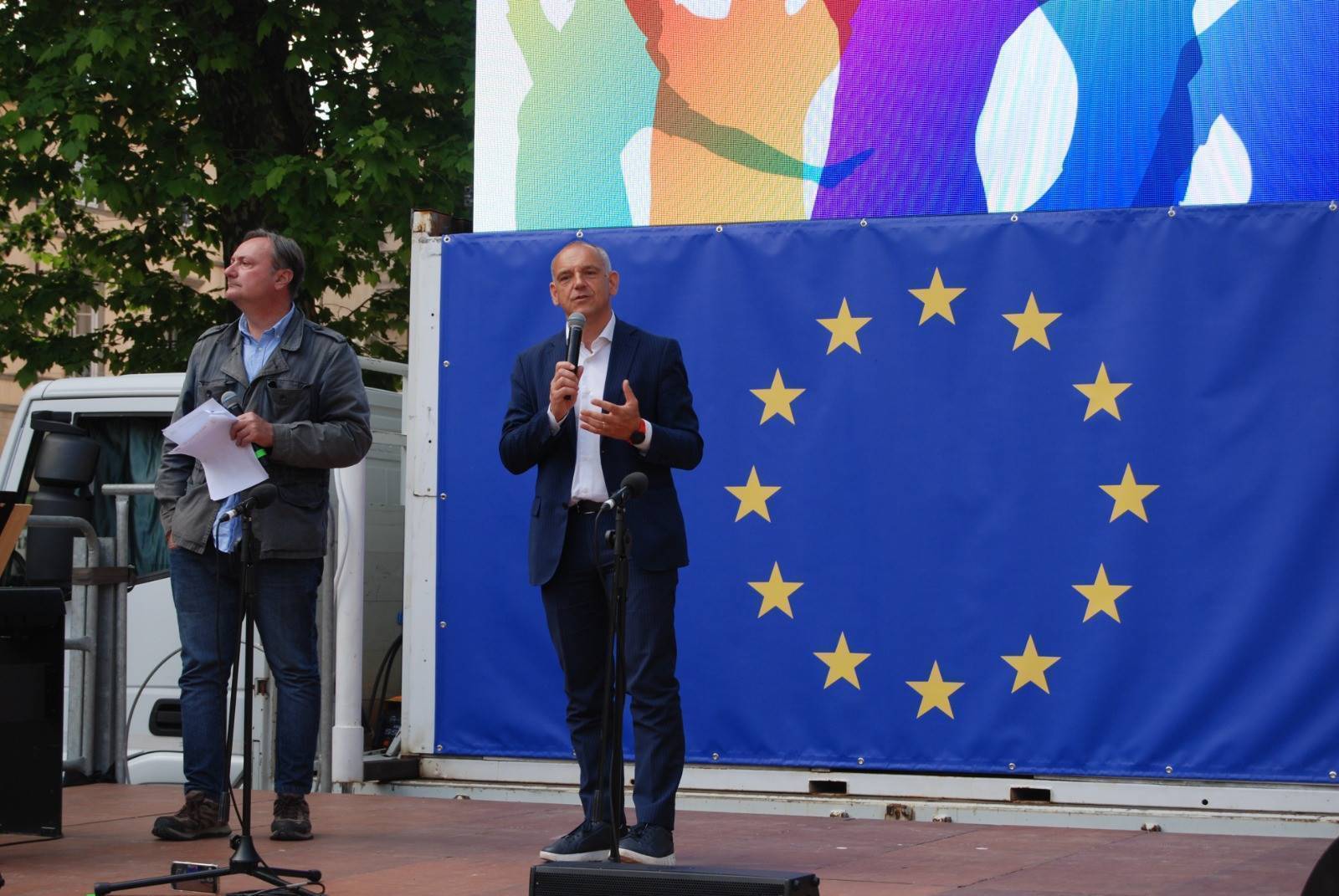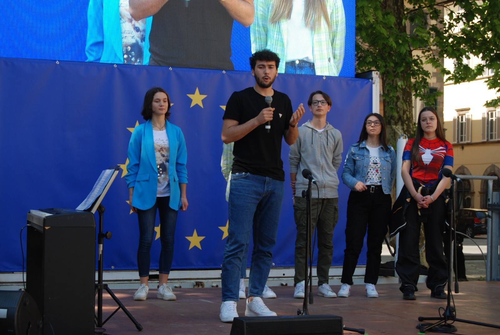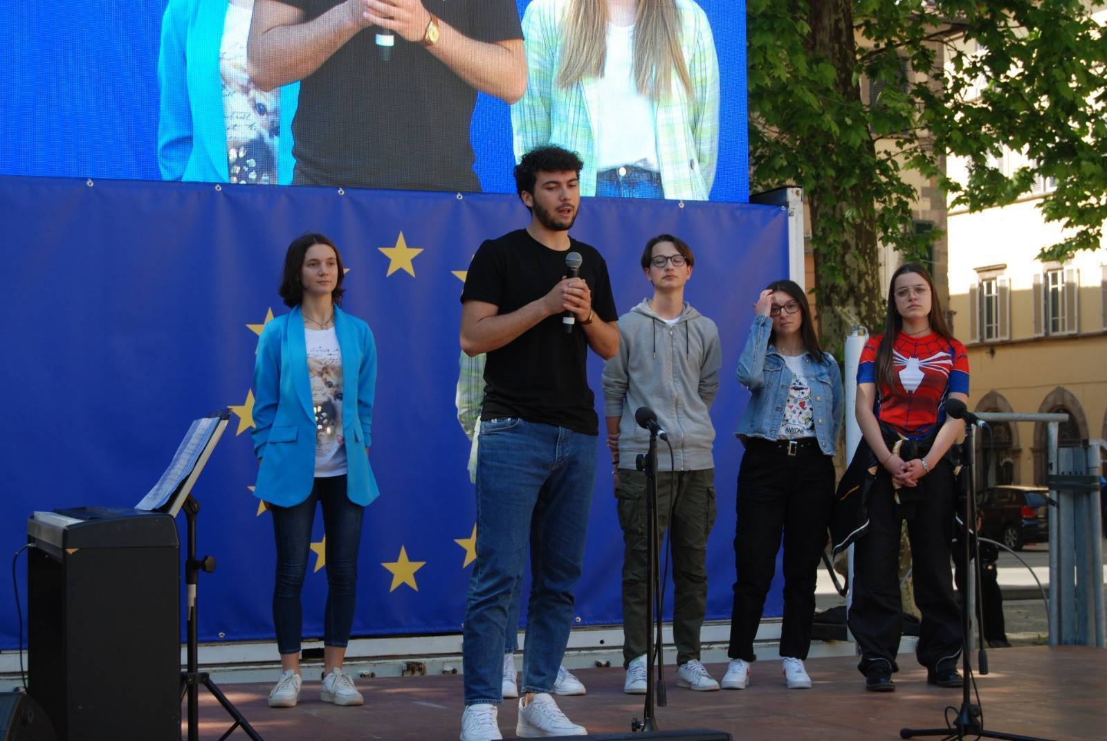 "Sono molto contento di vedere le tanti classi che abbiamo incontrati durante tutti i nostri incontri qui riunite oggi per festeggiare l'Europa - ha esordito Luca Menesini, presidente della provincia di Lucca -. Spesso abbiamo la sensazione che l'Europa e le sue istituzioni rimangano per noi qualcosa di lontano e astratto, chiuso nei palazzi di Bruxelles. È su questo che come provincia di Lucca abbiamo voluto lavorare, rivolgendoci a coloro che nella nostra Europa sono nati e stanno crescendo: i nostri giovani."
