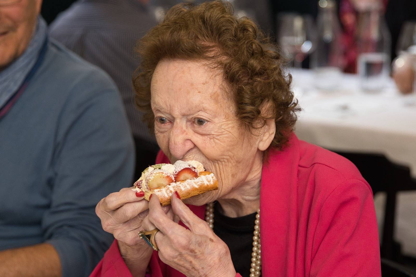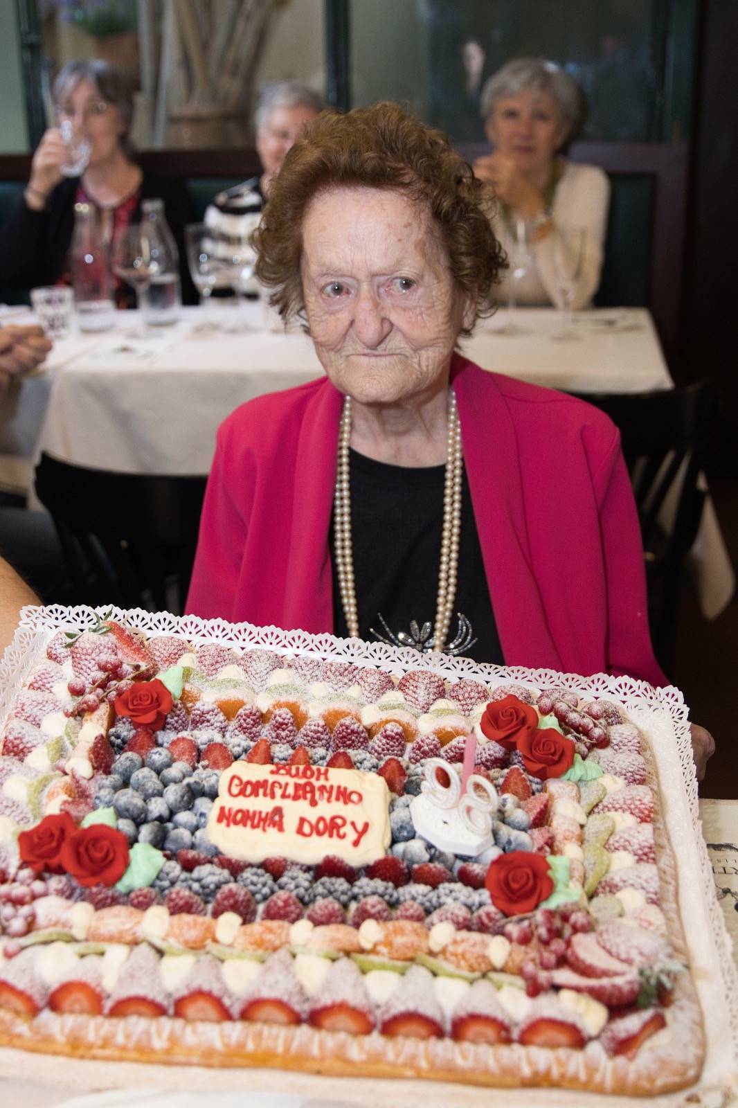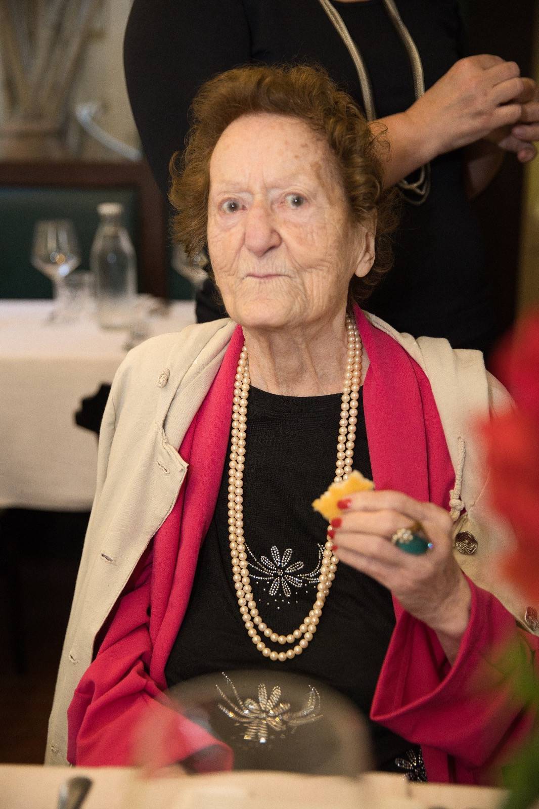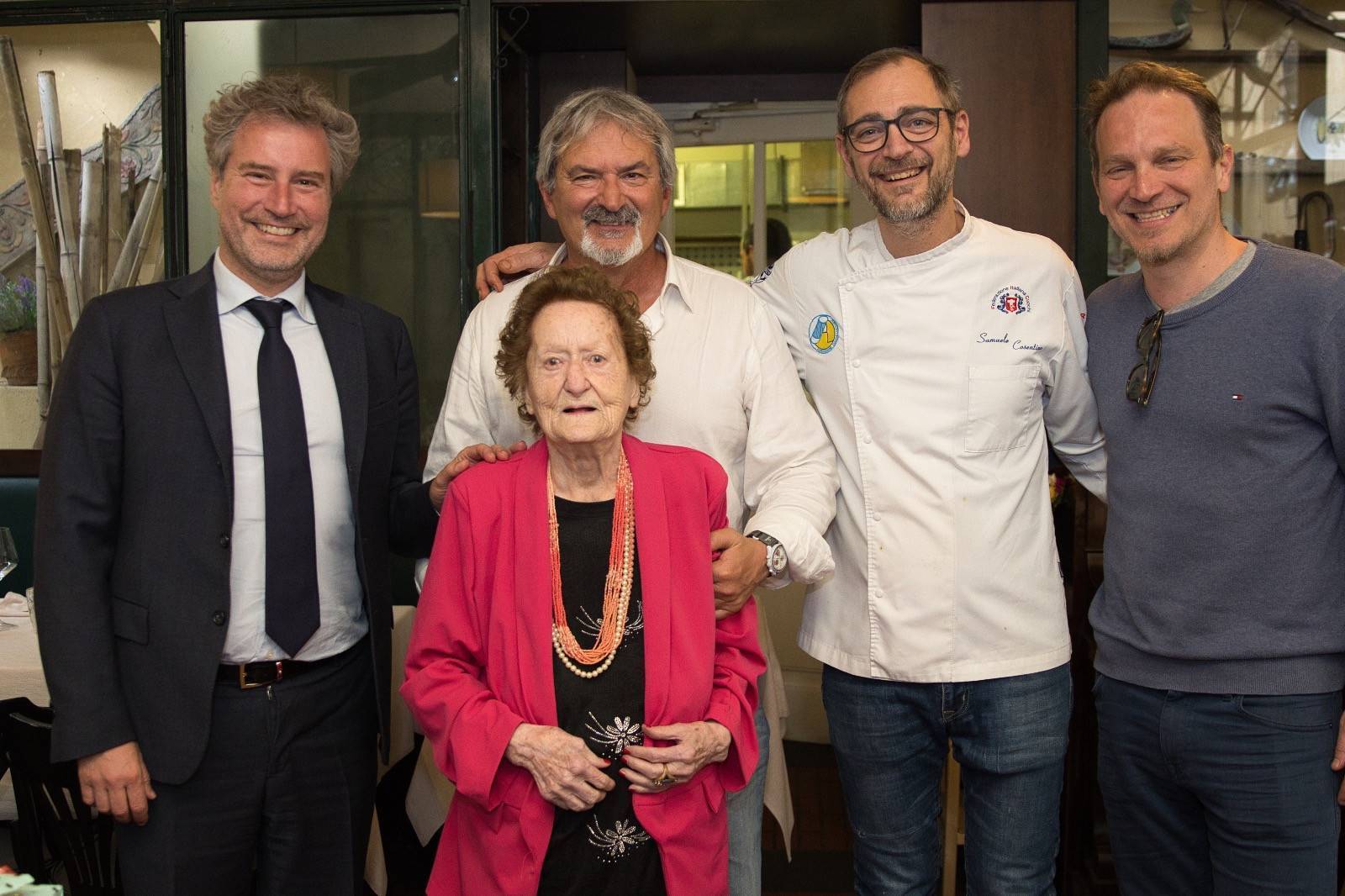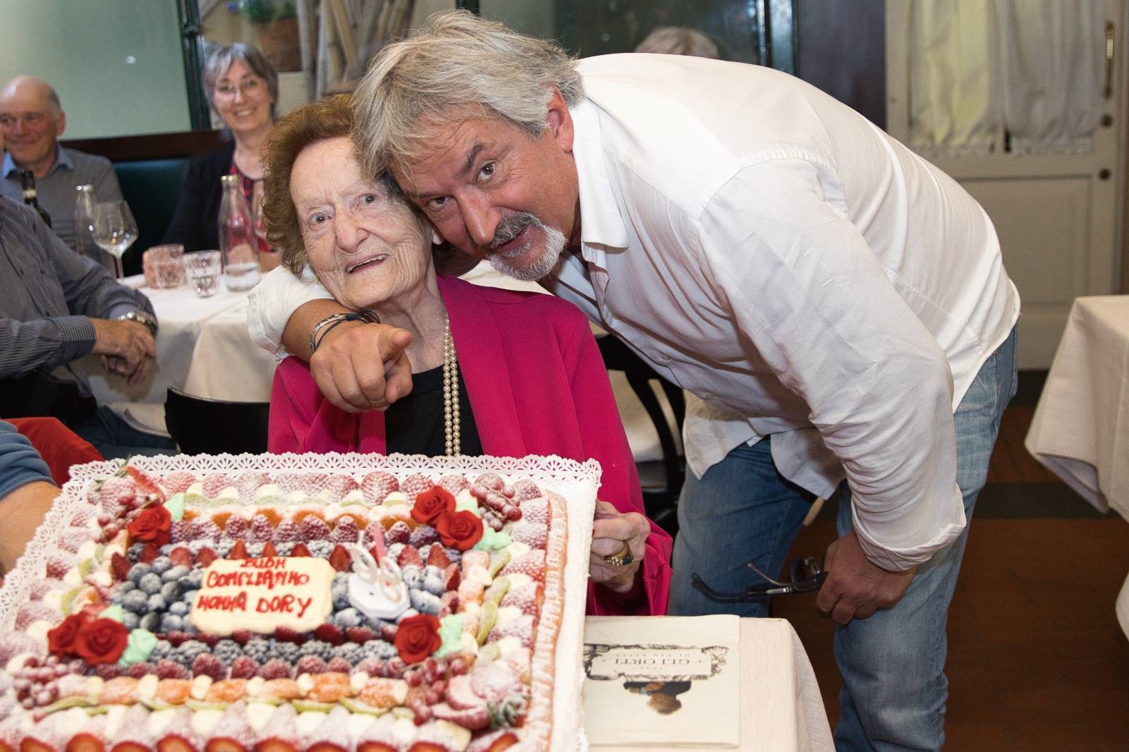Samuele Cosentino l'ha accolta seduto al suo pianoforte dove ha suonato qualche motivo dopo aver depositato su ogni coperto un dépliant-menu con impressi sia il volto della festeggiata sia il numero 98.