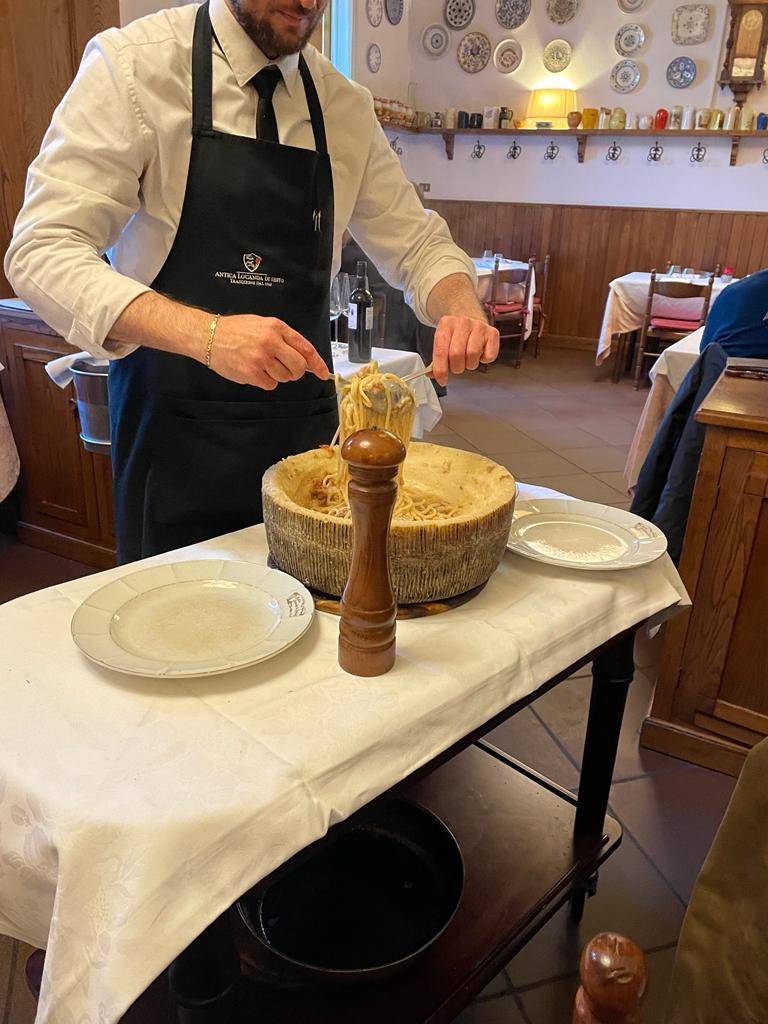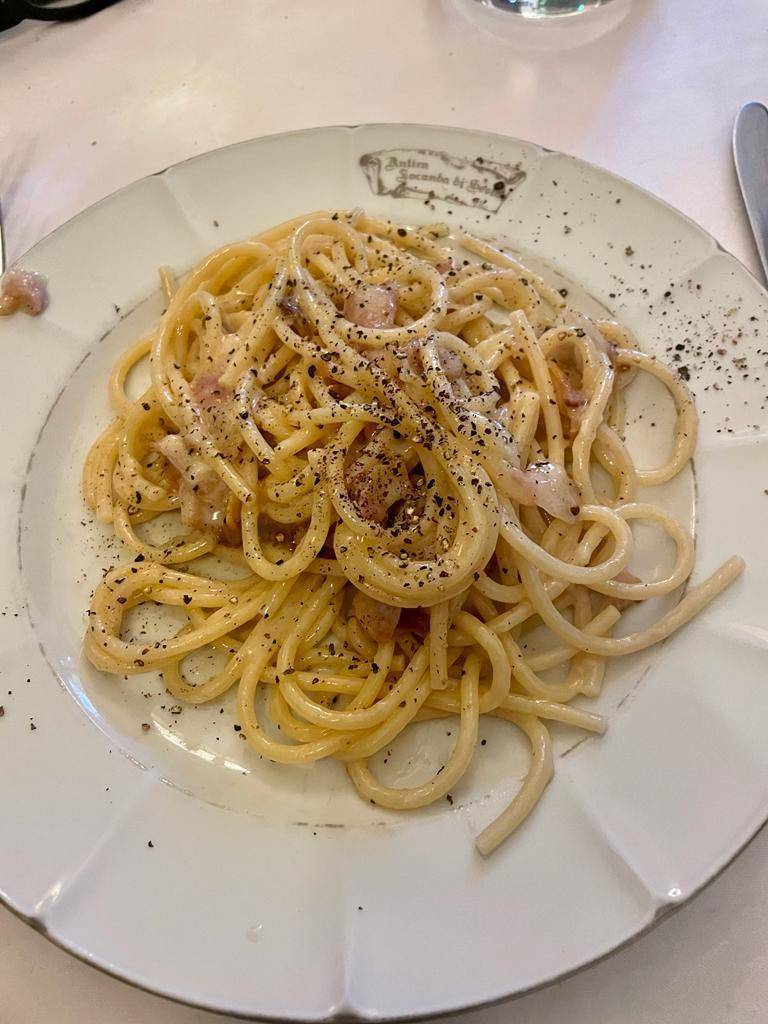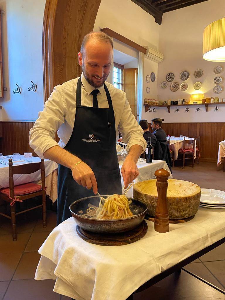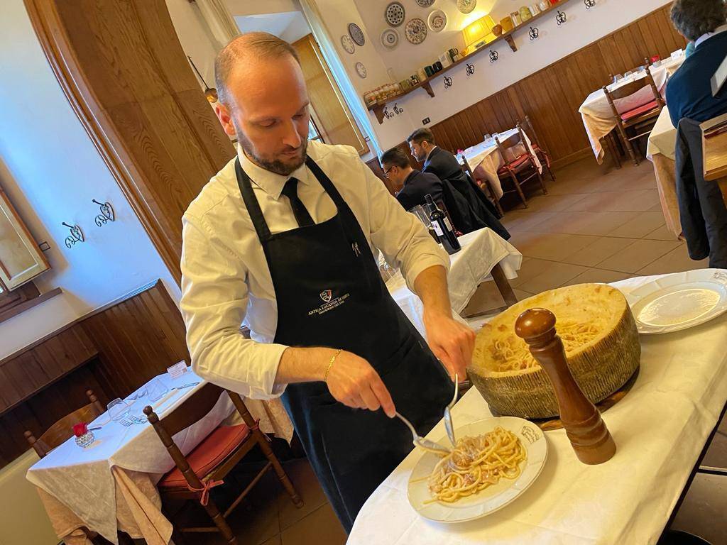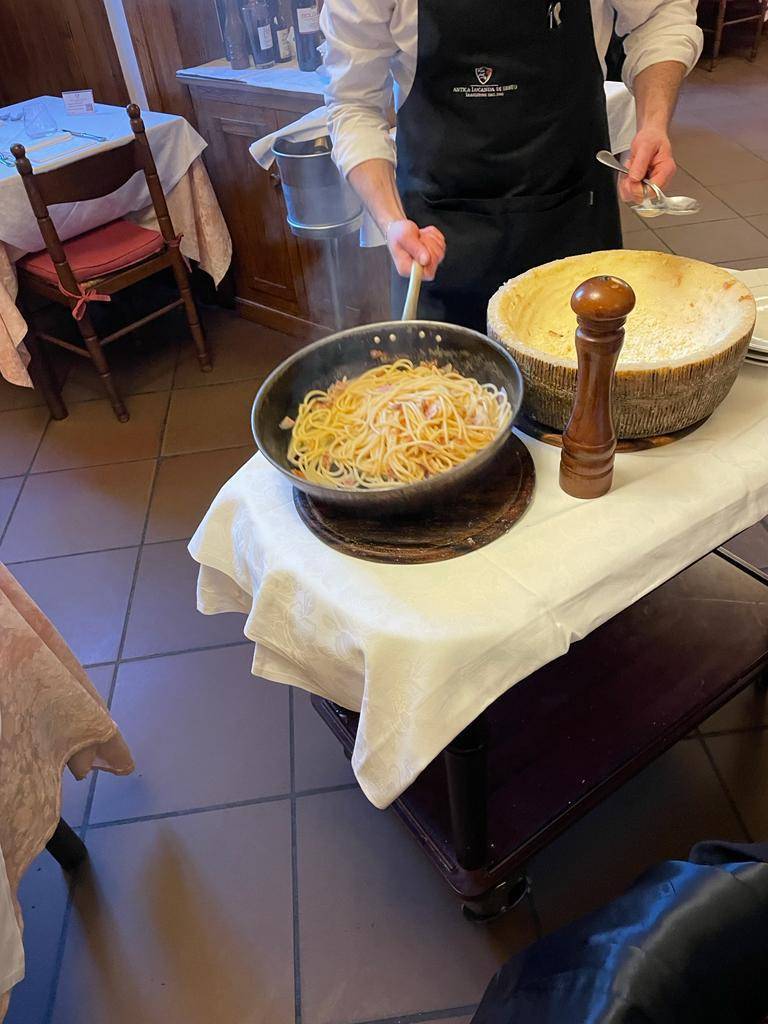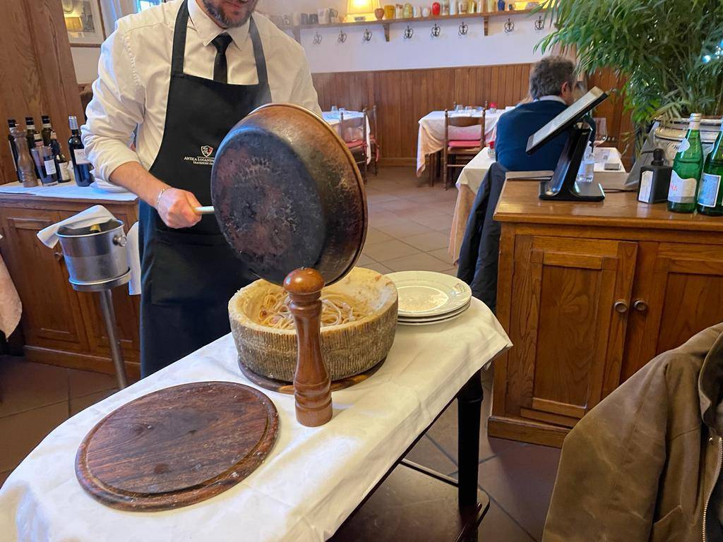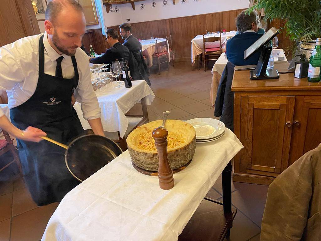 Quasi tutti si gettano, però, sugli spaghettoni “Senatore Cappelli” Felicetti al guanciale e pecoringrana, tantissima roba, mantecati dentro la forma di formaggio grana. Eccezionali, paragonabili alle fettuccine Alfredo in via della Scrofa a Roma.