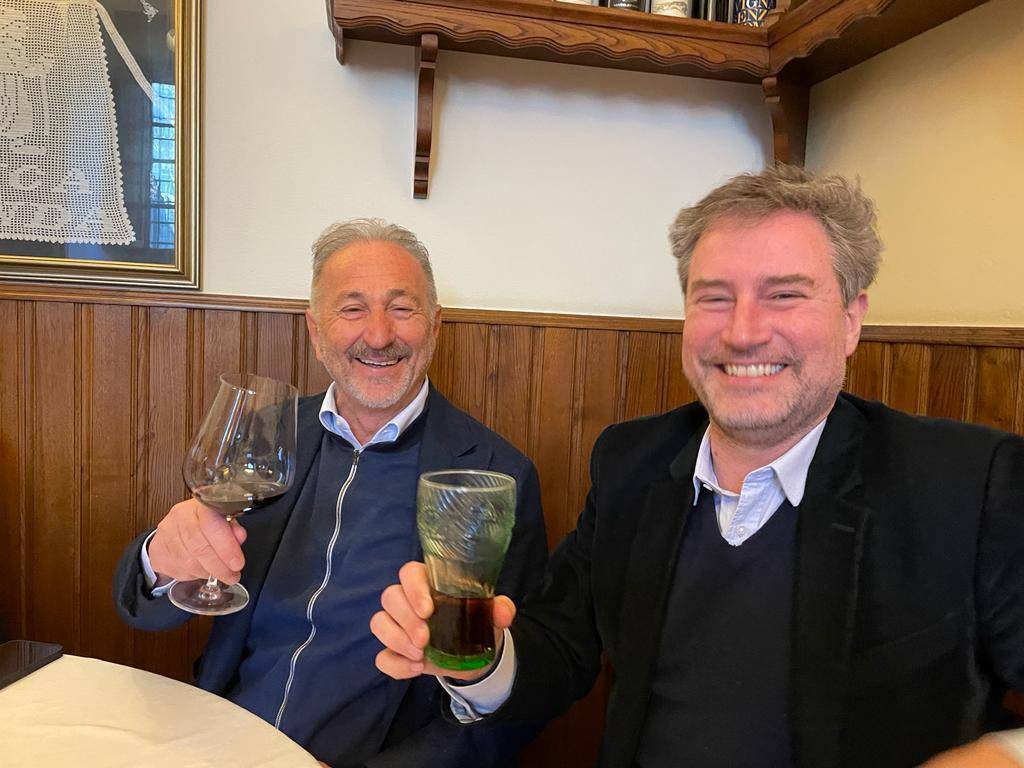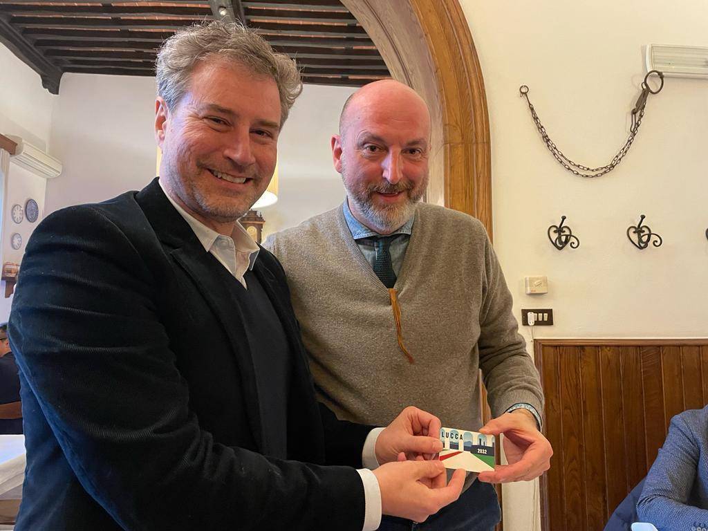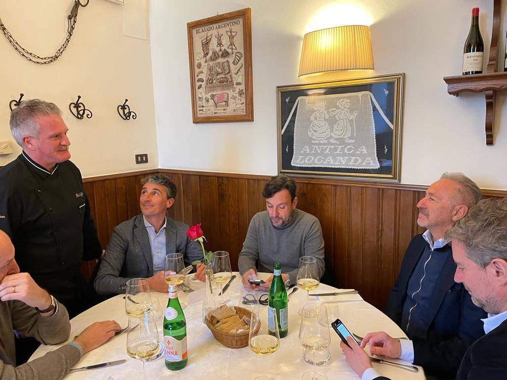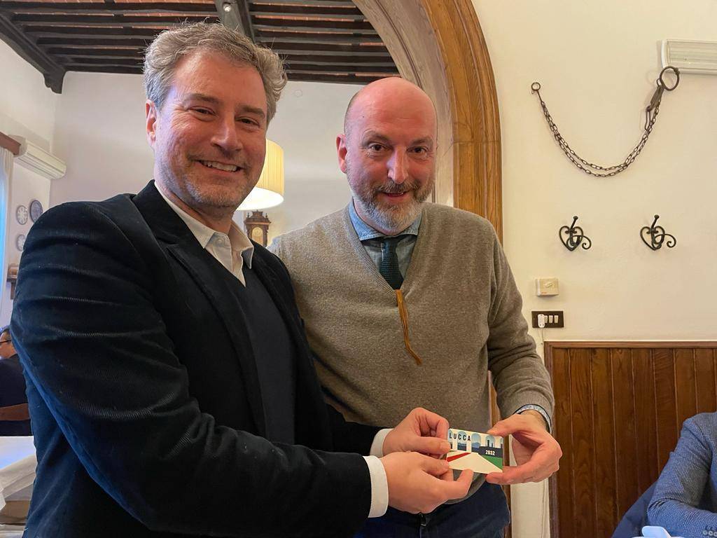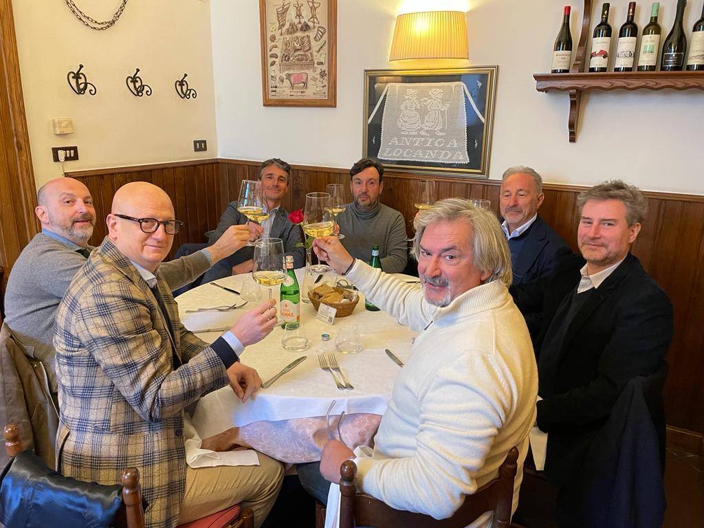 Côte à côte del promotore dell'iniziativa, Marco Simonetti, medico dentista titolare dello studio Santa Apollonia di Porcari insieme a Rosaria Sommariva. Simonetti è un amico e una bella persona, innamorato sportivamente del basket - ma è un problema suo - è stato tra coloro che hanno dato l'anima e anche qualche soldino per la pallacanestro lucchese salvo, poi, restare così deluso da tirarsi indietro e non pensarci più. Ciònonostante si reca al Palatagliate per vedere i beniamini della palla a spicchi. Si trova vicino, senza conoscerlo, Piero Pacini, gelatiere e non gelataio. A proposito di gelati: durante un pomeriggio di un lunedì di inizio febbraio, in un'ora che siamo stati dentro al suo locale di via Roma, non c'è stato un momento di sosta nell'affluenza dei suoi aficionados, addirittura in fila per attendere di degustare il gelato tra i più buoni di questa zona terracquea. Piero Pacini è stato tra i primi ad iscriversi a Luca 2032, il movimento politico fondato da Mario Pardini e Beniamino Placido, tessera numero 122. Poi, però, l'adesione è scemata fino, addirittura, al video promozionale con cui, poco prima del voto, lo stesso Pacini si è speso a favore del candidato di sinistra Francesco Raspini. Qui a tavola, tuttavia, nessun rancore e tutti amici come prima.