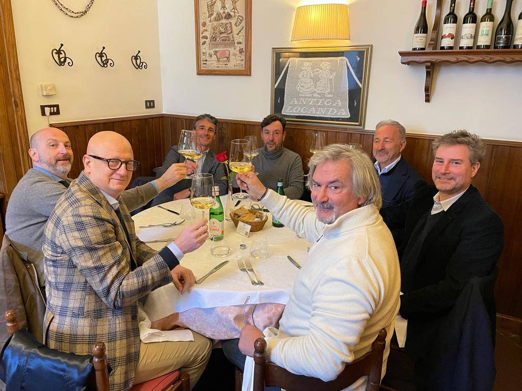 Battute a parte, al suo fianco sta seduto un altro gaudente per eccellenza, Flavio Torrini, di professione assicuratore, fratello dell'attuale presidente del consiglio comunale Enrico, abitante a S. Pietro a Vico con moglie e tre figli, maestro di sci, fisico asciuttissimo e tirato come una corda di violino nonostante a tavola non si dia pace e si tuffi con gioia, ma senza avidità, sulle pietanze che gli compaiono davanti. Flavio Torrini è un iperattivo, puoi trovarlo il giorno prima sulle Dolomiti, quello successivo sulle Alpi e, il terzo, in sella ad una bicicletta che si sciroppa chilometri su chilometri. Durante il Covid, arrivava fino alla croce della Brancoleria, sopra Gignano di Brancoli, si fermava come se niente fosse da Paolino Luporini della Tosca, mangiava e, poi, giù di nuovo in discesa con la sua bici da urlo. Torrini è di compagnia, è il ritratto dell'ottimismo, trasmette buonumore, fiducia e se può si fa in quattro e anche in otto, in particolare, durante il periodo tristissimo per i negozianti del lockdown, si è attivato su facebook affinché i lucchesi aiutassero in tutti i modi, con gli acquisti, il commercio della nostra città. Anche lui bellissima persona.