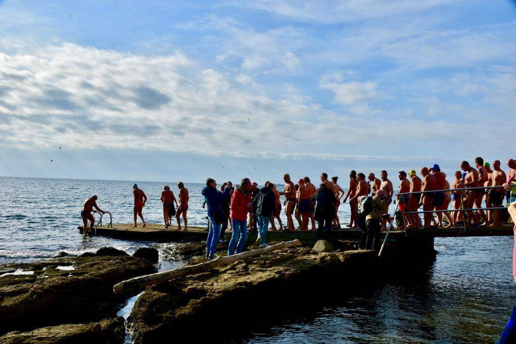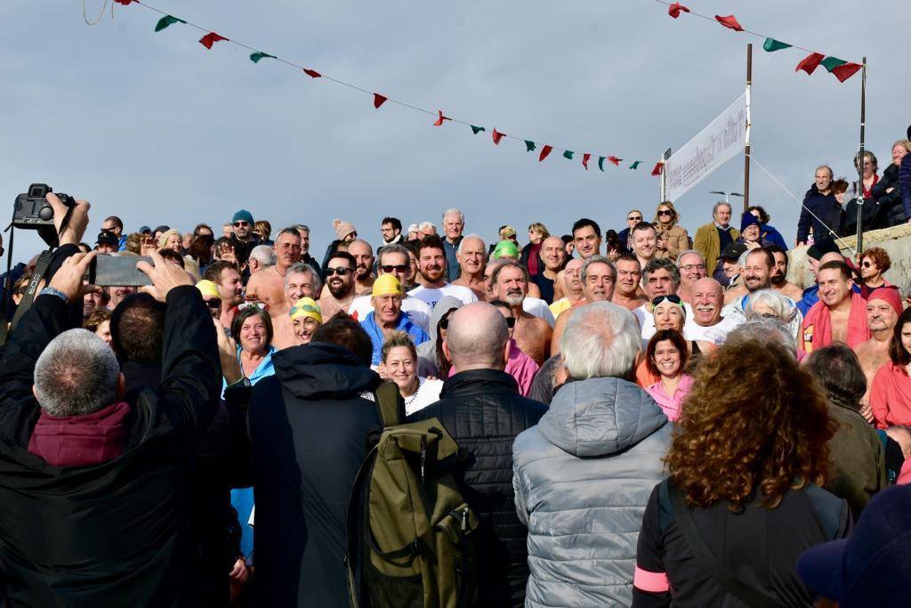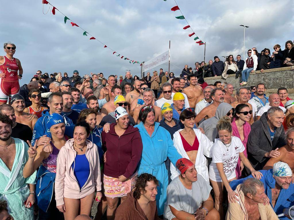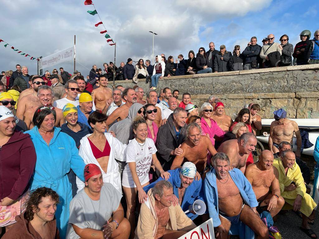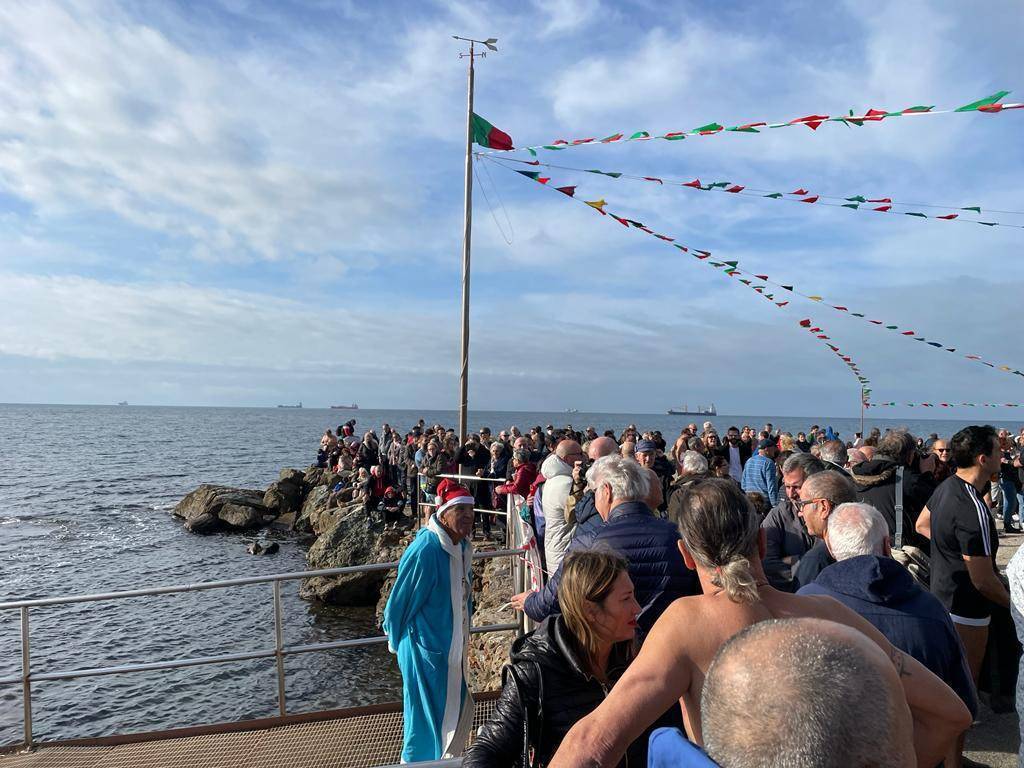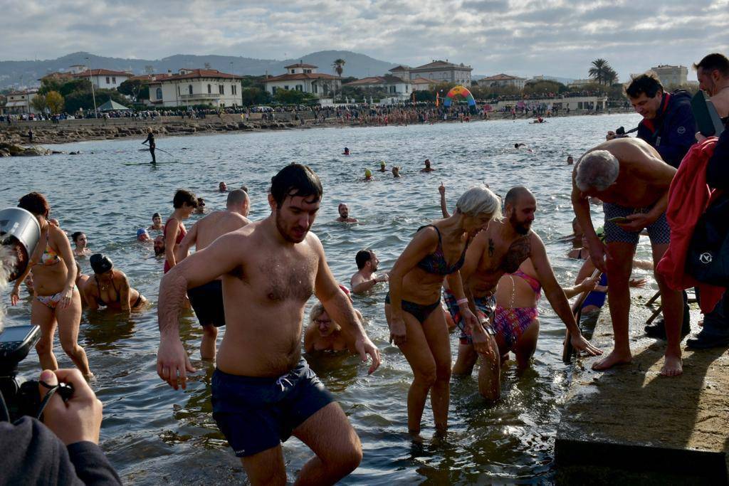 Quasi 200 persone tra grandi e piccini si sono dati appuntamento questa mattina poco prima di mezzogiorno al Gabbiano dell'Ardenza, per fare il classico tuffo in mare di Capodanno che, poi, ognuno è stato libero di restare in acqua quanto voleva. Prima l'iscrizione sul foglio appeso al muro e, quindi, la preparazione per entrare in acqua a partire da mezzogiorno in punto. Pubblico delle grandi occasioni per assistere all'evento che, poco più in là, ai Tre Ponti, si ripeteva con un'altra ondata di bagnanti sia pure in numero inferiore. In mare anche i volontari con tanto di cani da salvataggio appostati sulla tavola e pronti per lanciarsi in acqua. Uno in particolare, un Golden Retriever di cinque anni e di nome Ettore, ha mostrato le sue capacità natatorie e di riporto.