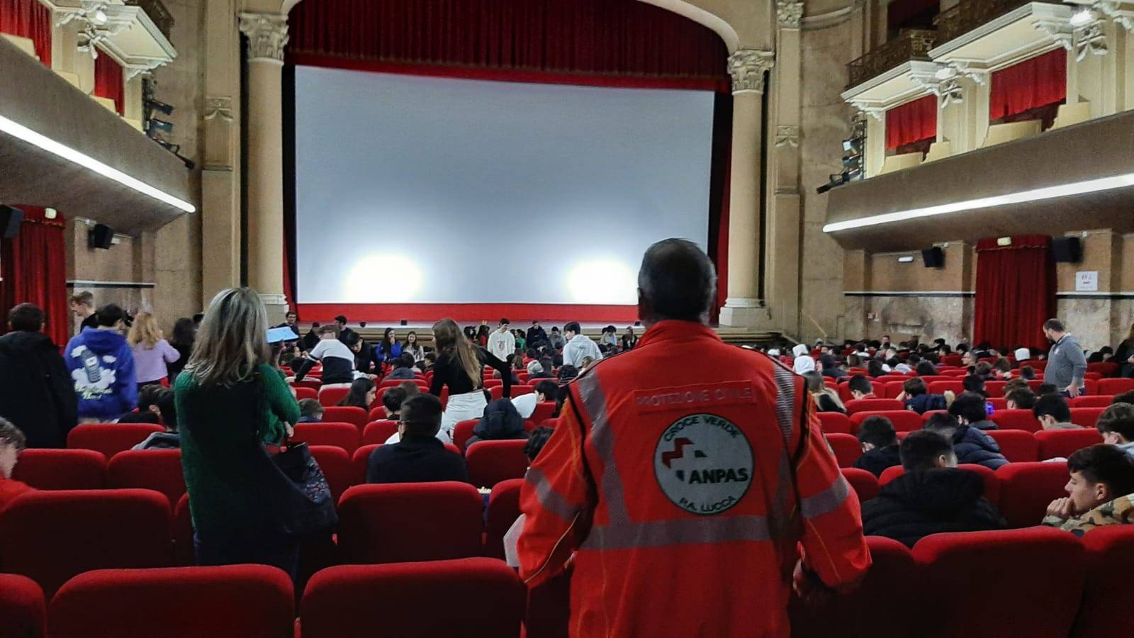 Prima della proiezione, oltre ai Volontari della Croce Verde Lucca sono intervenuti i rappresentanti de Il mondo di Claudio Marchini Onlus, che da anni collabora con il Sodalizio di viale Castracani per la sensibilizzazione dei più giovani nell'ambito dell'educazione stradale.