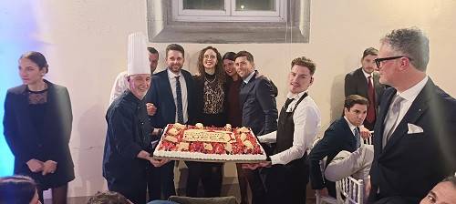 “Il tordello, in passato – ci spiega Luca – era il piatto di Natale, o dei giorni di festa, ed era riempito con la carne proprio perché era una cosa rara, oltre che grassa. Oggi non è Natale, o un giorno di festa, ma lo standard della vita moderna ci permette di gustare questo piatto molto più spesso rispetto ad una volta”. La portata principale è stata, a seguire, un maialino di cinta alle erbe fini, cotto a bassa temperatura, su crema di patate allo zafferano in cialda di pane tostato. Una versione attualizzata di un piatto molto conosciuto come il filetto di maiale. I vini proposti sono stati, come rosso, un Chianti “Colle Pino” della Tenuta di Montalcino Cantine Banfi mentre, come bianco, “Le Rime”, sempre di Montalcino, delle cantine Famiglia Banfi. Per il gran finale della cena, che ha lasciato tutti veramente soddisfatti, dopo i saluti ed i ringraziamenti di rito da parte degli organizzatori del Convegno, è stato proposto un bellissimo e buonissimo dolce “celebrativo”, realizzato dal laboratorio dello Stuzzichino. Un pan di spagna, bagnato con una soluzione alla vaniglia con crema chantilly e frutti di bosco su cui è stato posto, come decoro, il logo del convegno stampato su un foglio di cioccolato bianco. Particolarmente accurato è stato il servizio ai tavoli da parte del personale, sapientemente coordinato da Luca e dalla moglie Paola. La serata si è poi definitivamente conclusa, a ritmo di musica, nel salone attiguo a quello del “Capitolo” allestito, per l’occasione, come un vero Disco bar, dove tutti gli invitati hanno potuto ballare fino a tarda notte sorseggiando vari drink e cocktail sapientemente preparati dallo staff. Non c’è che dire, quindi, la serata affidata dai Giovani Commercialisti Lucchesi alle sapienti mani dello Stuzzichino Events di Paola Barbuti e Luca Buoni, è stato un vero e proprio successo.
