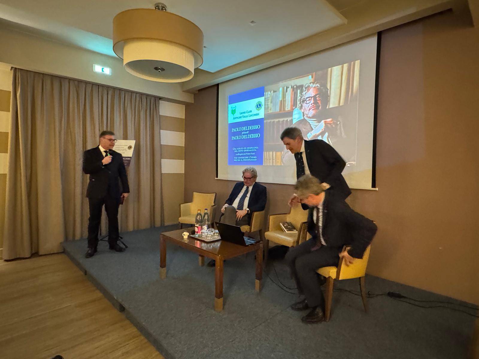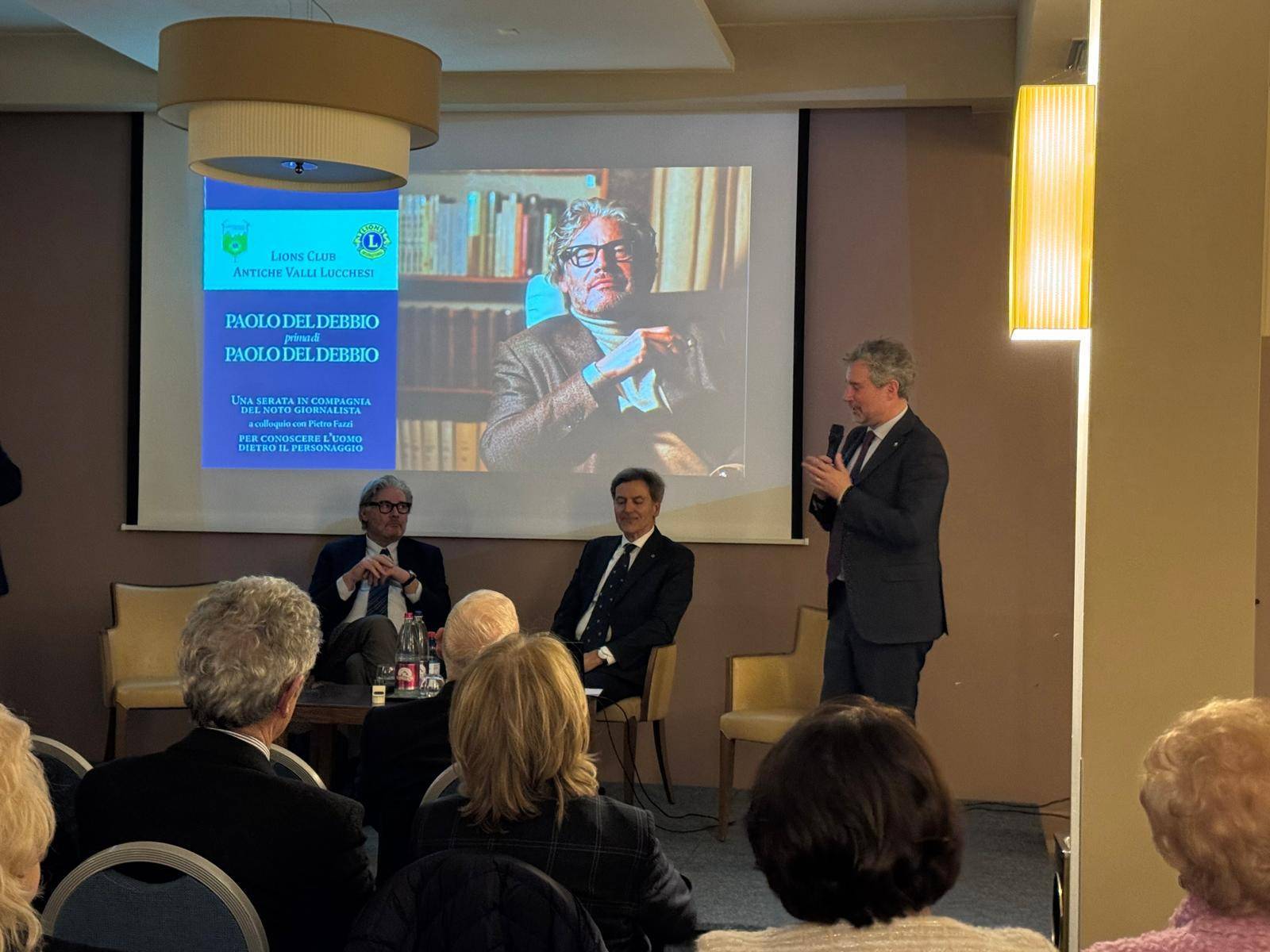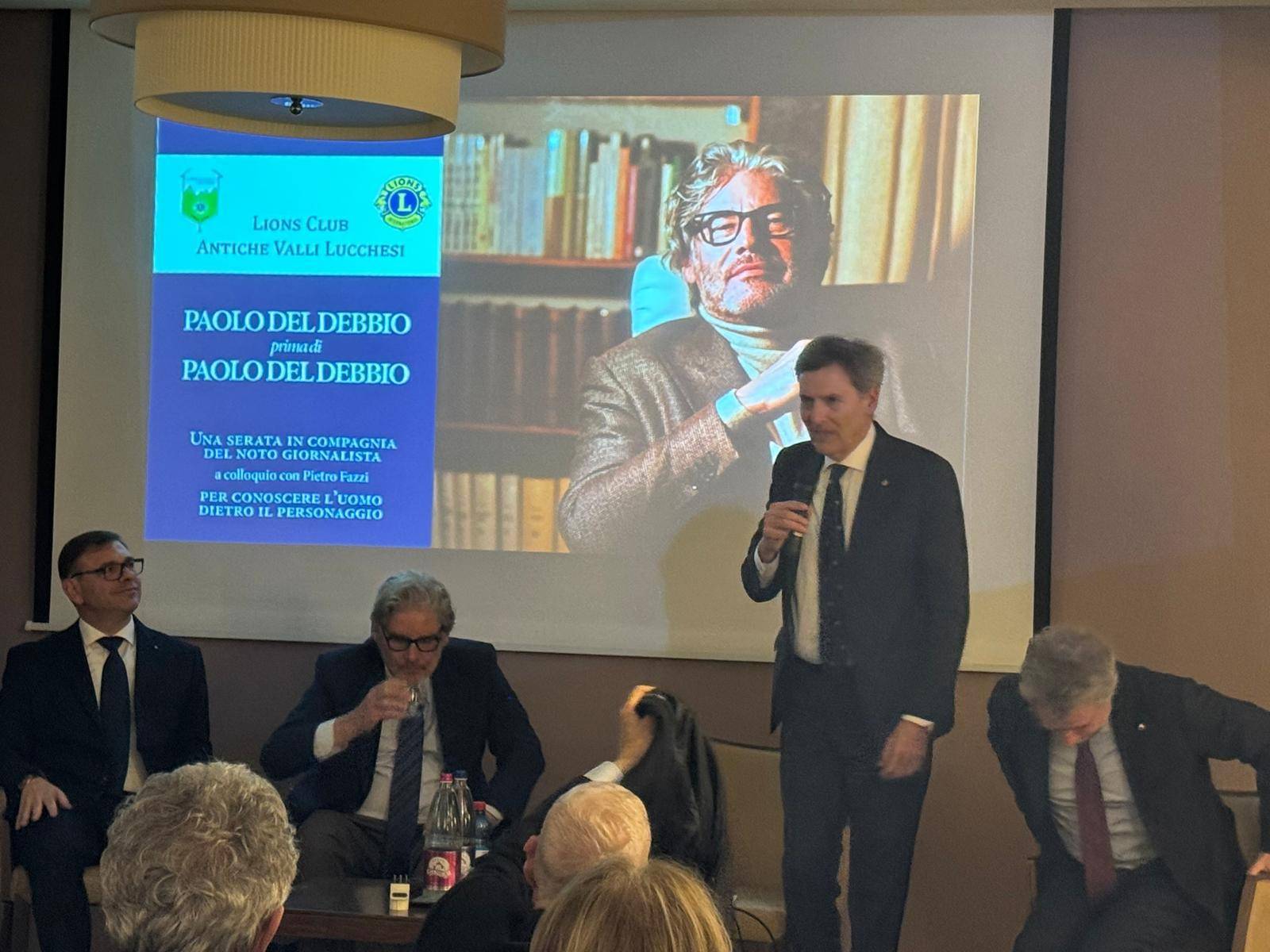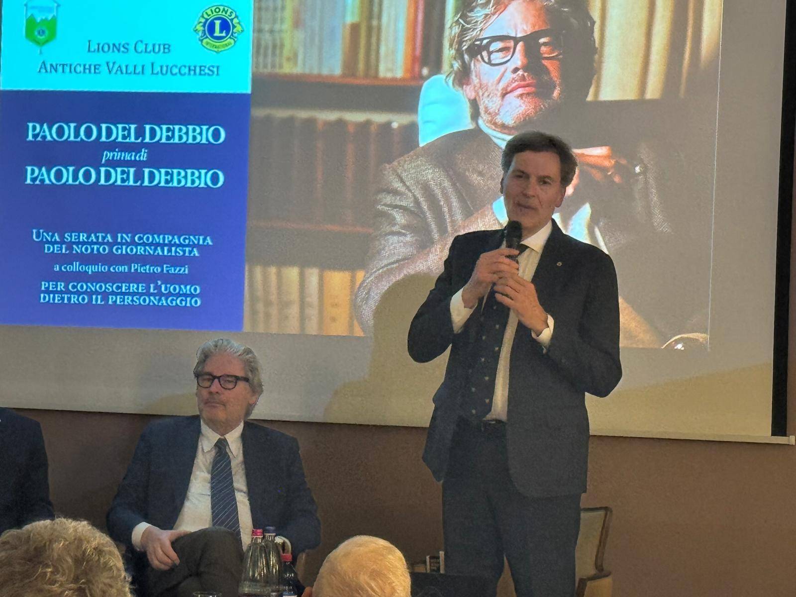 Una serata in compagnia di Paolo Del Debbio, questa è la giusta definizione dell’evento che si è tenuto sabato al Grand Hotel Guinigi sulla via Romana grazie all’iniziativa dei Lions Club Antiche Valli Lucchesi. Hanno aperto la serata con i saluti di rito e la presentazione degli ospiti il presidente del Club Giovanni Illibato e il sindaco di Lucca Mario Pardini. Il noto giornalista è stato magistralmente intervistato da Pietro Fazzi, ex sindaco della nostra città, che ha indagato sull’uomo che sta dietro il personaggio. Non a caso la serata si intitolava “Paolo Del Debbio prima di Paolo Del Debbio“.
