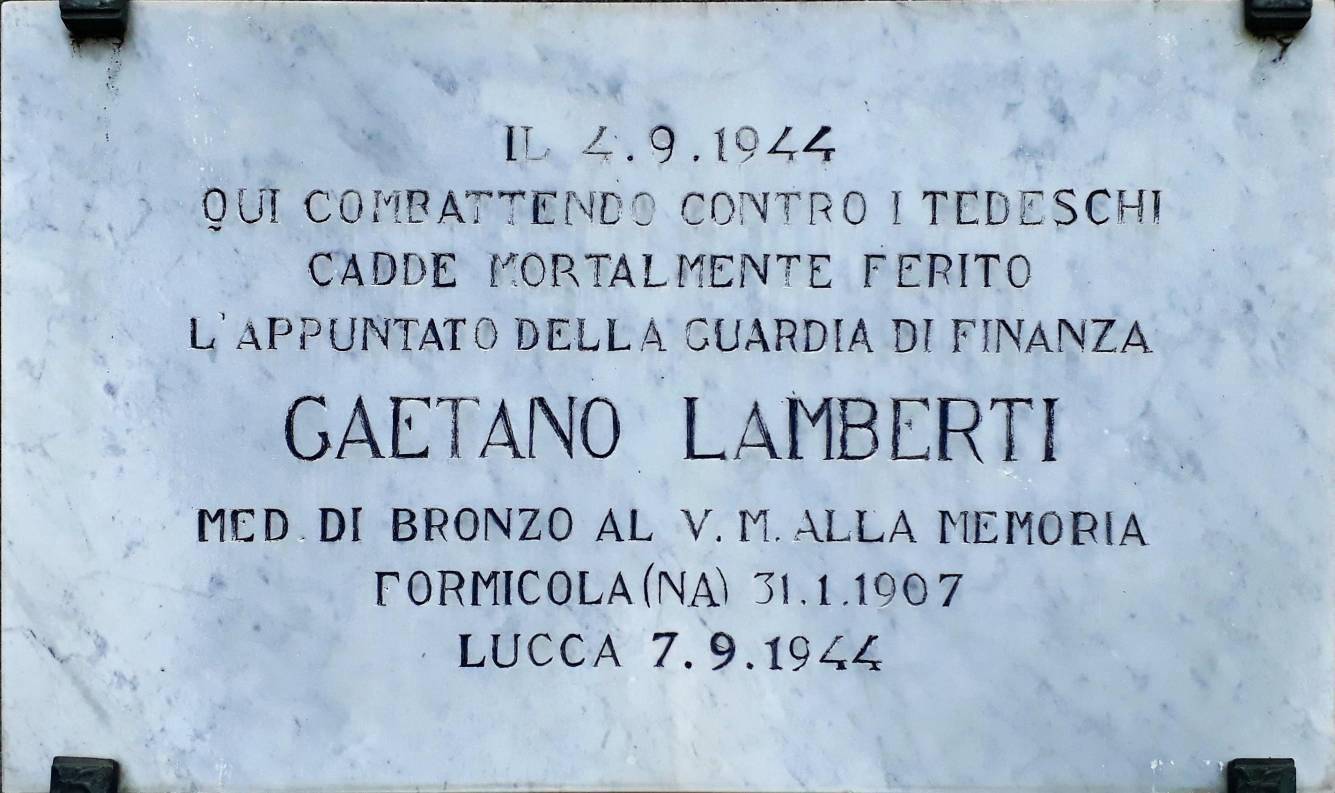 Gaetano Lamberti nasce il 31 gennaio 1907 a Formicola, in provincia di Caserta. Entrato volontario nel Corpo della Guardia di Finanza nel 1925 aveva avuto la sua prima sede a Trento, per poi essere trasferito ad Ascoli Piceno, a Formia, a Littoria e quindi a Lucca dove arriva nel 1939. Sposato, con una figlia, nel 1941 riceve la croce d’argento al merito di servizio. Per il suo sacrificio gli è stata riconosciuta la medaglia di bronzo al valor militare e una targa lo ricorda presso piazzale Verdi (Porta Sant’Anna) dove successi i fatti.