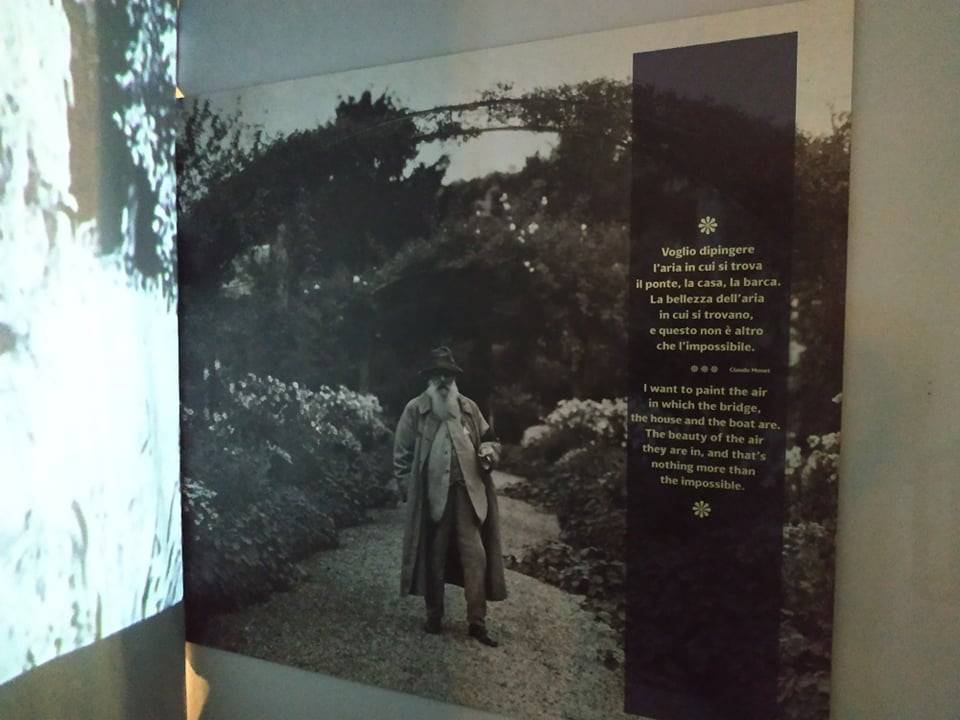 Nella mostra, si può vedere tutto ciò che è stato il genio di Monet: il pittore che ha reso possibile la percezione su tela del vento, della luce del sole, della nebbia di Londra che tutto avvolge e per aiutare il visitatore alla comprensione, alle pareti pannelli che focalizzano l'attenzione sulla tecnica pittorica di Monet, il suo "occhio" che osserva e riproduce ciò che vede, anche quando, questa vista manca e si arriva alla produzione contaminata dalla malattia oculare, poi recuperata grazie ad un'operazione: i salici piangenti, il ponte giapponese, la natura generosa di Giverny che Monet dipinge come un cieco che riacquisisce la vista.
