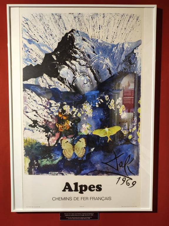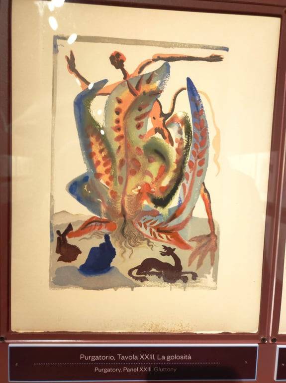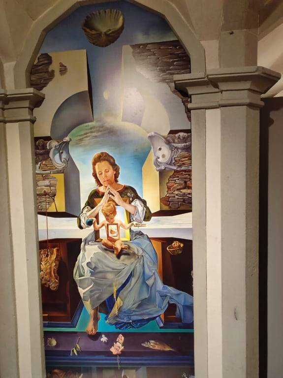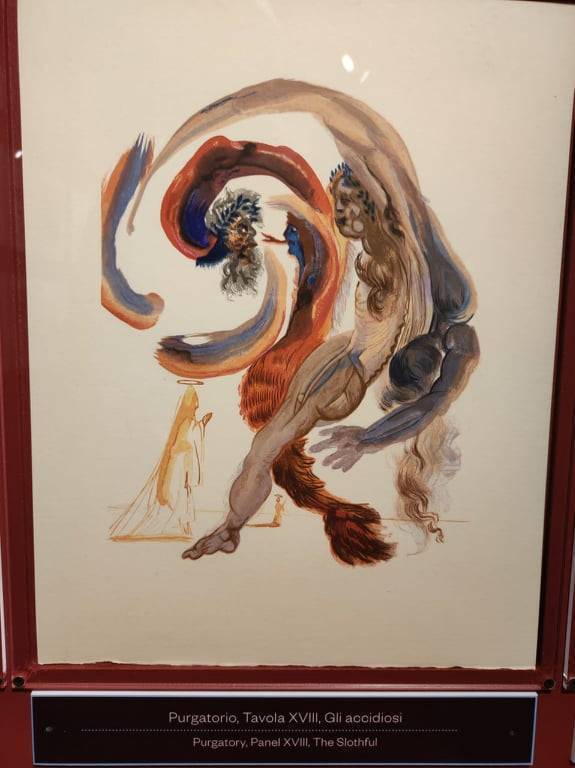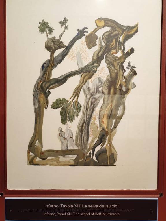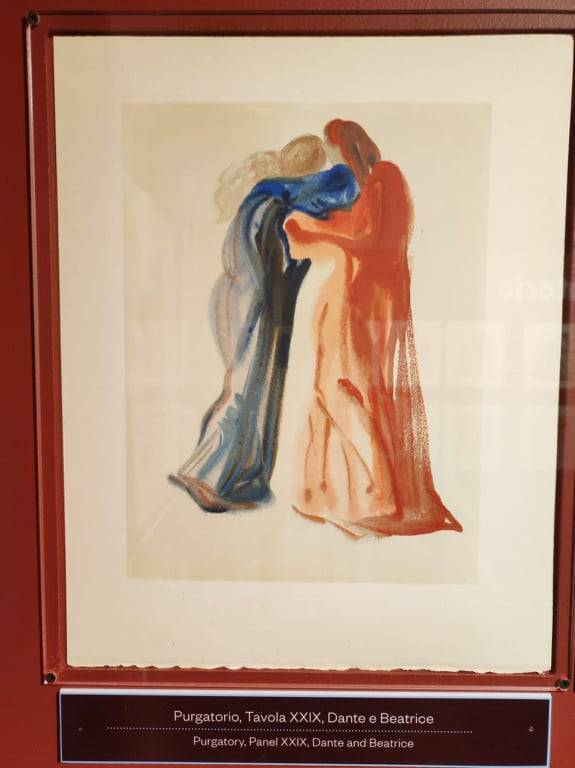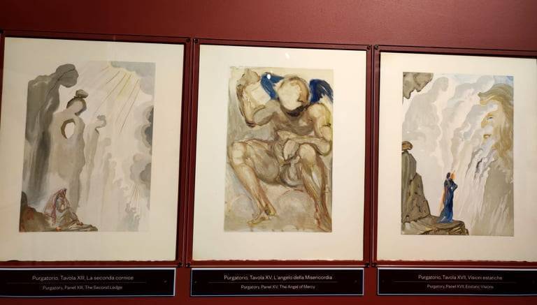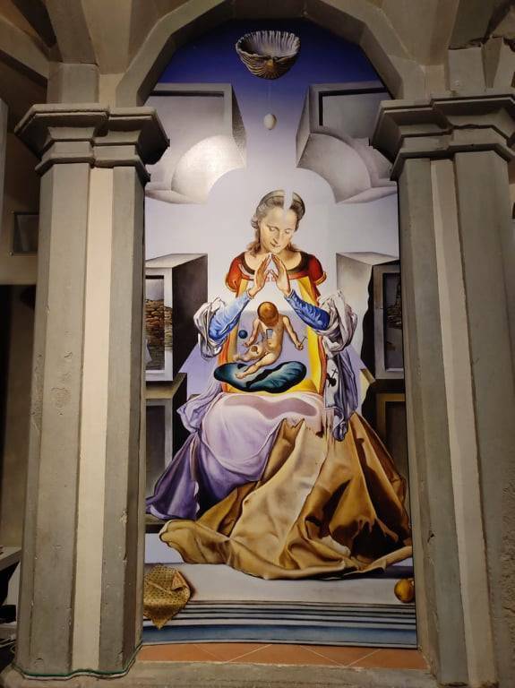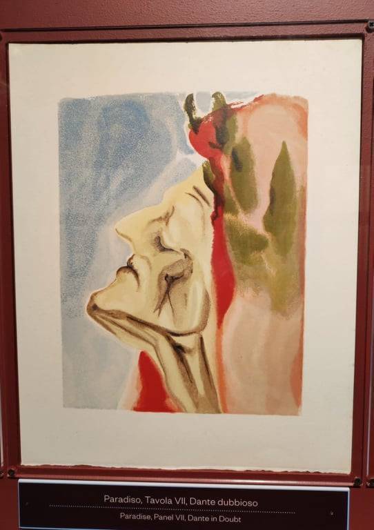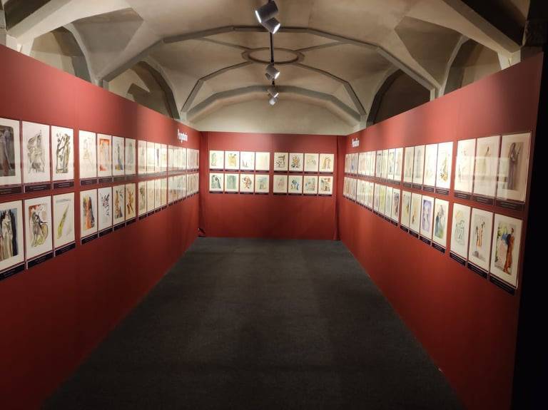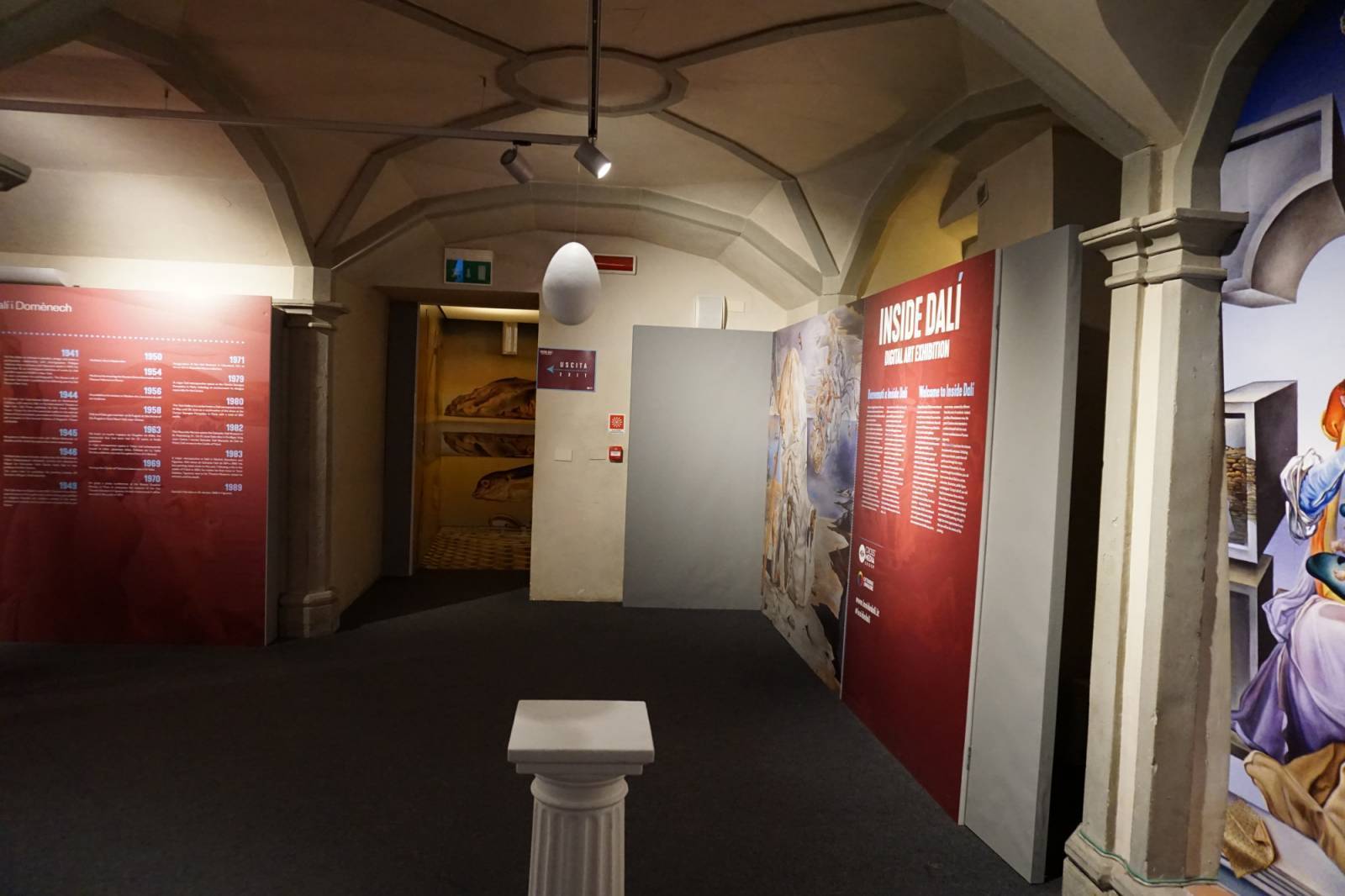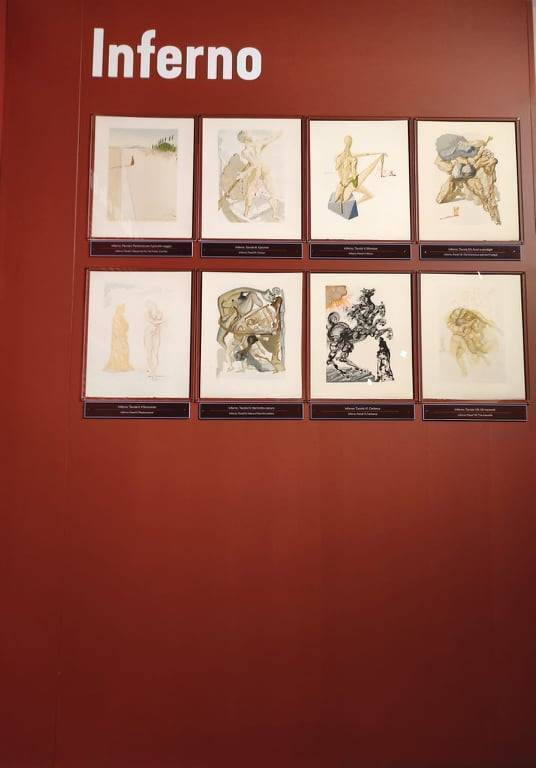 Tre sale, tre universi. La prima, suddivisa in varie sezioni: dalla speculare riproduzione delle Madonne di Port Lligat, con al centro un uovo appeso, simbolo daliniano contenuto nei suoi quadri; alla sezione vinili, con un quartetto di cover realizzate dallo stesso pittore; fino alla serie di manifesti disegnata per le ferrovie francesi. In mezzo: documentari, cimeli e una selezione di illustrazioni sulla Divina Commedia commissionate all'artista nel 1960 per celebrare il 700° anniversario della nascita di Dante Alighieri.