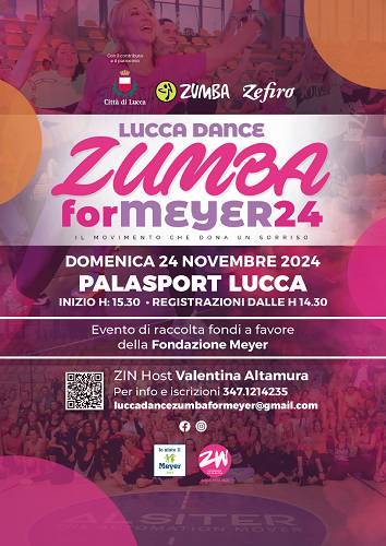 https://www.zumba.com/it-IT/event/view/lucca-dance-zumba-for-meyer-2024 . L'ingresso è unico per i partecinati alla masterclass alla cifra di 18€, importo che verrà interamente devoluto all'ospedale pediatrico Meyer. Per informazioni 347 12 14235