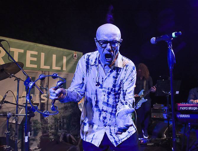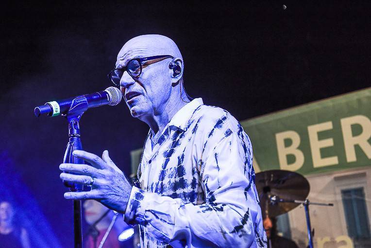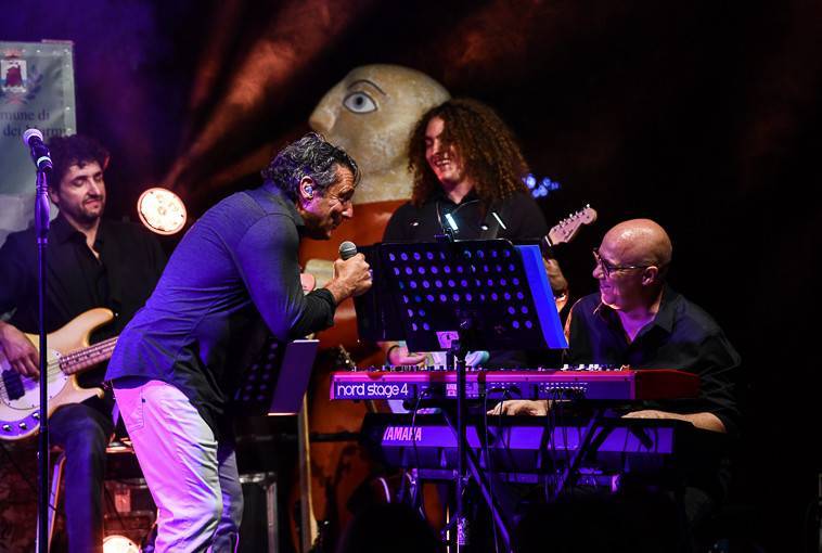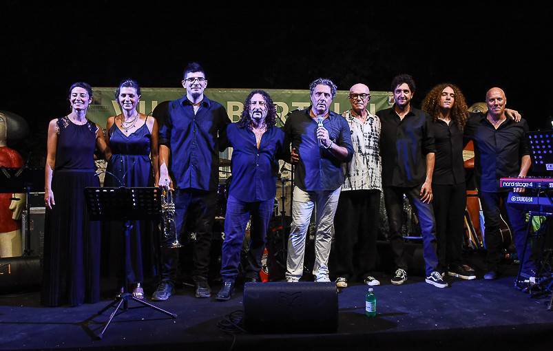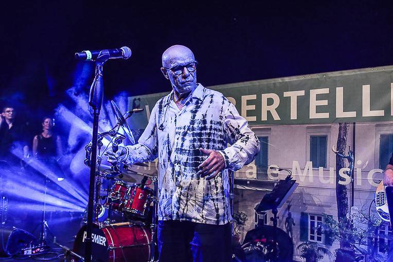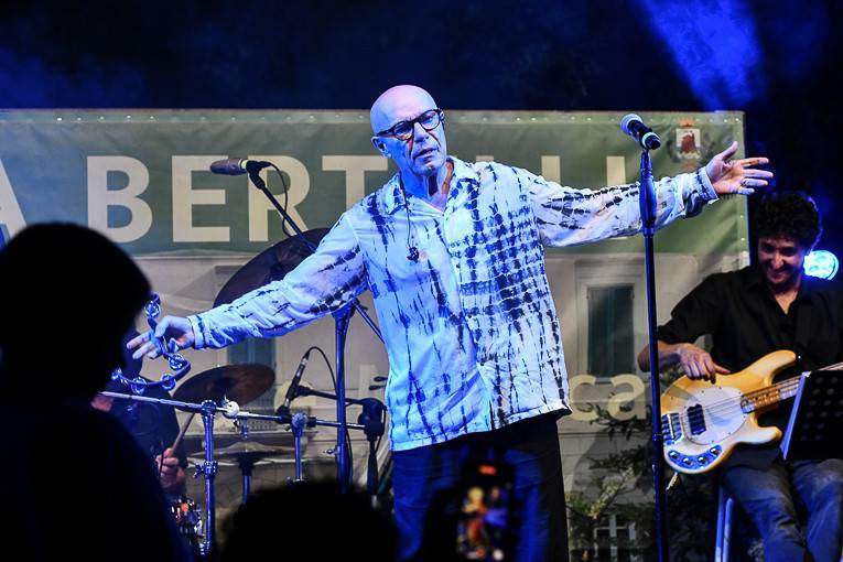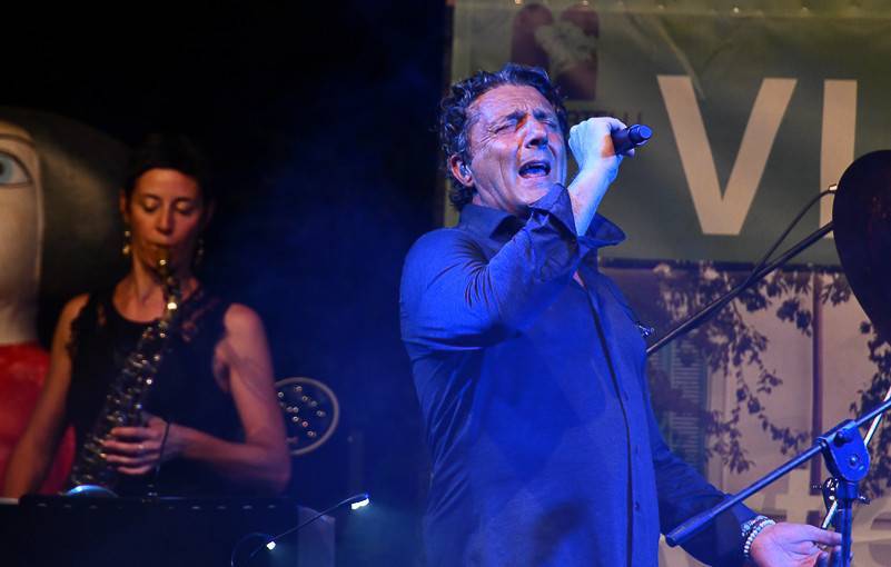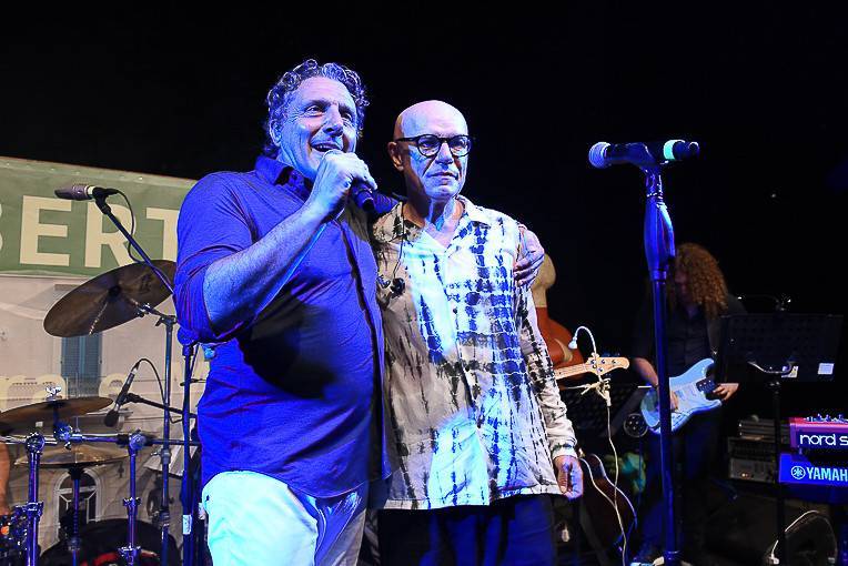 Se la serata è calda, afosa, sul palco l’aria è incandescente. Andrea canta di un mondo dove i colori sono sette: pochi, ma buoni. Sette, come le note sul pentagramma. “Solo… Nascosto in questo mondo” si confida. E già affiorano le prime sfumature blu(es) del suo carattere. Il tastierista, Fabio Marchiori, accenna un motivo swingato. “Donna, torna perché…” e l’estensione della sua voce si dilata, l’atmosfera si incendia e la sezione fiati – composta dal duo Tommaso Iacovello (tromba) e Sigi Beare (sax) – spinge a fondo (per dirla alla Paolo Conte) “come gregari in fuga…” Ma, si sa, come cantava Vasco: “Non si può spingere solo l’acceleratore…” E allora Andrea ha rallentato con un brano più romantico, sentimentale, scritto proprio al Forte, non lontano da qui. Poi, di nuovo da solo, si concede “…mille passi nella notte, mille passi per sognare…”