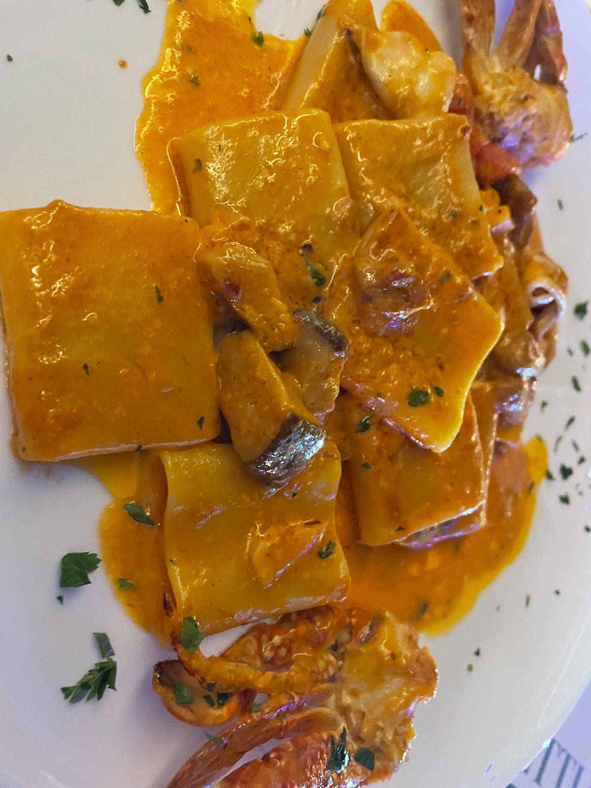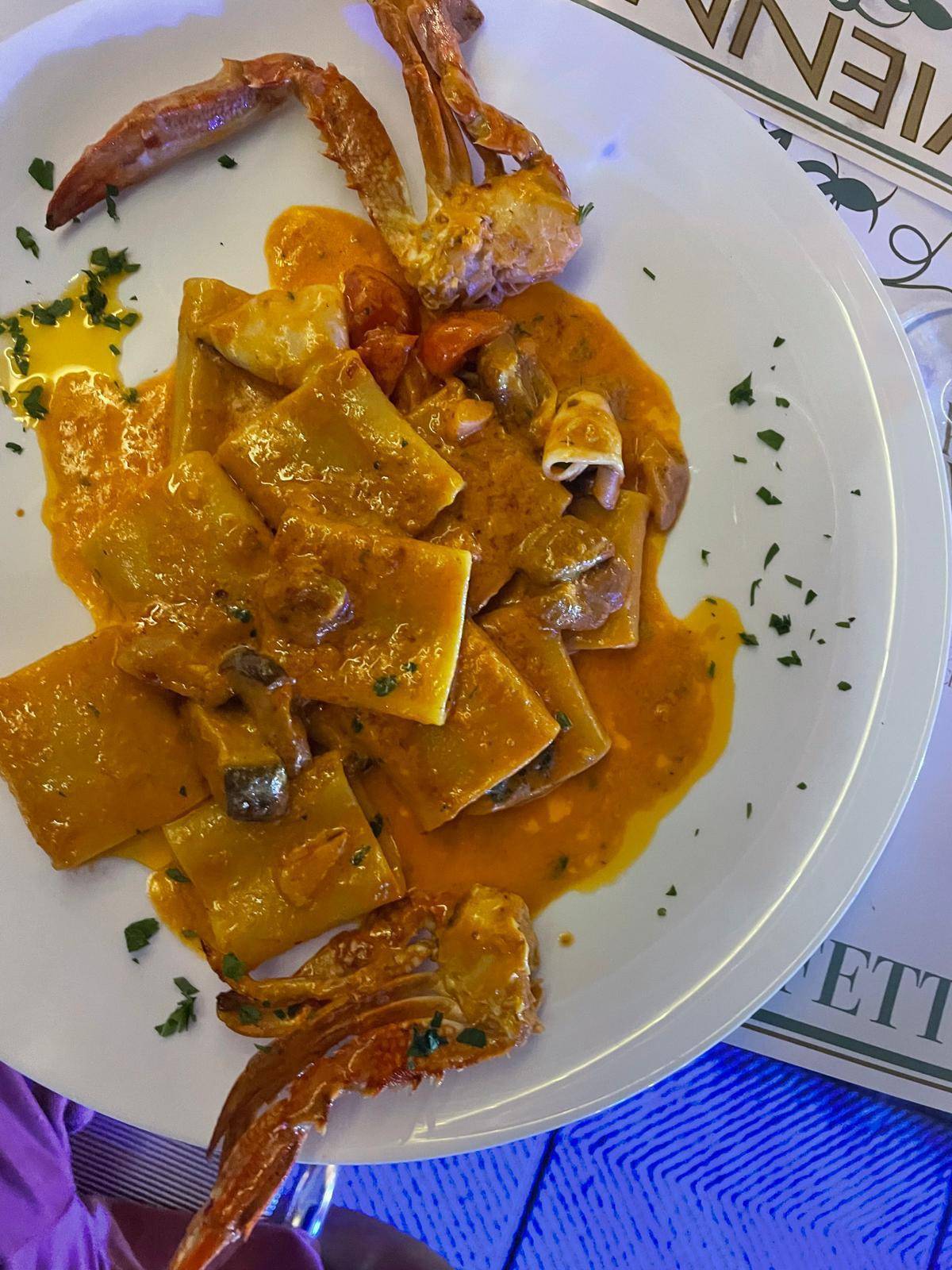 Del Bagno Biondetti-ViennaLvce della famiglia Menici con Giacomo, Isacco e Monica oltreché Naghy Kamal, abbiamo scritto più volte su queste pagine: ambiente simpatico, godereccio, lussuoso nel senso più ampio del termine, dove si sta bene e si mangia in maniera splendida. Ecco, in questa occasione siamo rimasti colpiti, per l'ennesima volta, dal gusto dei piatti di pesce oltre, ovviamente, alle immancabili focaccine ripiene, dalla persona che sta dietro ai fornelli. Non è uno chef stellato e non cucina nemmeno Gourmet, però sa far da mangiare e lo sa fare talmente bene che i commensali, è bene sottolinearlo, lo considerano una sorta di Guru. Egiziano, sposato con Monica Menici, Dany è una persona di profonda cultura e altrettanta intelligenza con la passione, però, per tutto ciò che è bello e buono. Immancabile il suo incontro con la cucina italiana sin da quando, dal Cairo dove era nato e cresciuto, venne in Italia. La sua arte è sopraffina in particolare nella preparazione dei piatti a base di pesce, sia i primi sia i secondi. Ebbene, ieri sera ha sconvolto tutti provocando ripetuti orgasmi gastronomici al palato già ben disposto come accade ogni volta che varca la soglia del Bagno sul lungomare di Marina di Pietrasanta a Tonfano. Un primo che ha destato sensazioni interessanti e il desiderio, per scelta non soddisfatto, di fare il bis e anche il ter. Si tratta di un primo, i paccheri al sugo di granchio con pomodoro, calamaretti e, udite udite, funghi porcini. Un piccante da estasi e un profumo e un sapore spettacolari. Da provare assolutamente anche perché non ci era mai capitato, se andiamo a memoria, di riuscire a mangiarsi e godersi il granchio di una morbidezza e di una prelibatezza non comuni.