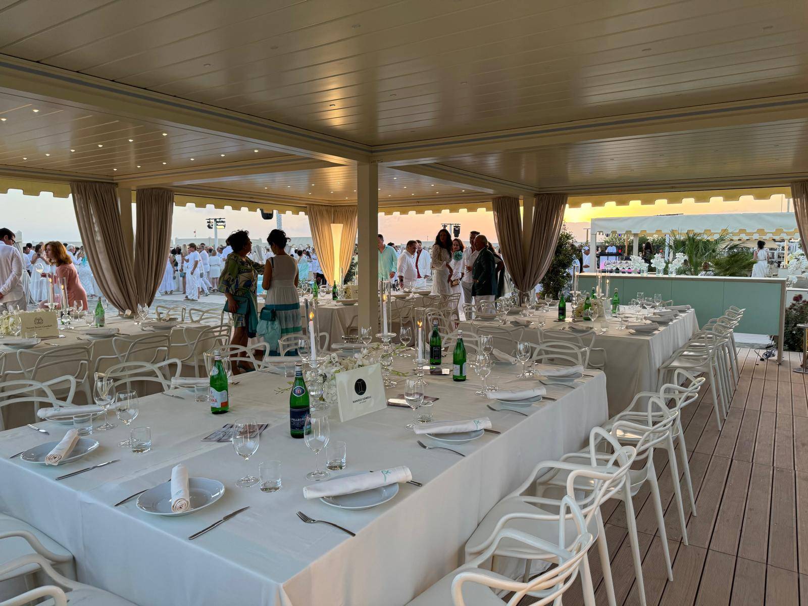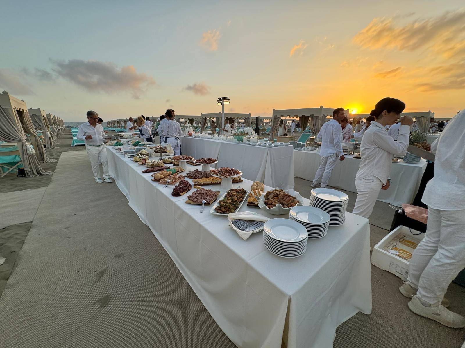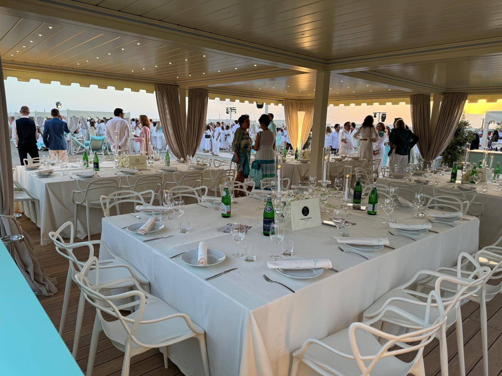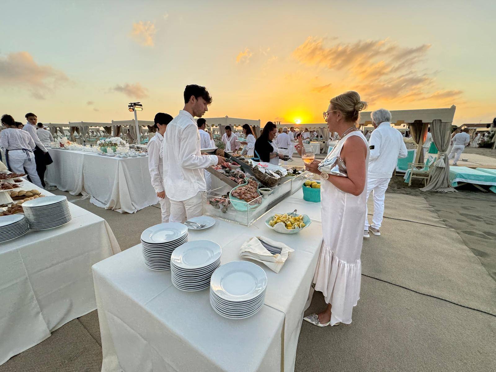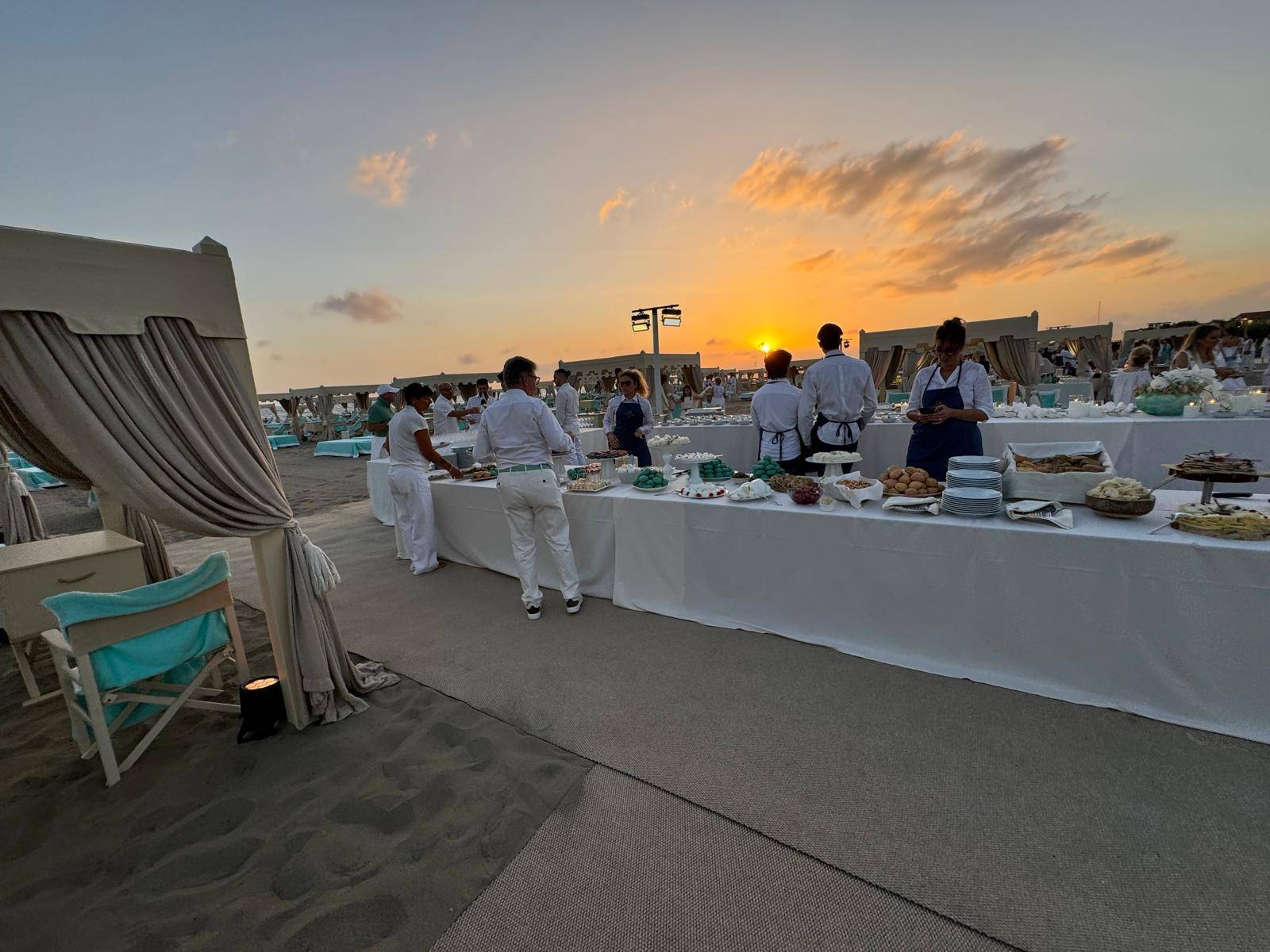 Alle 21 o giù di lì, tutti in spiaggia dove ad attenderli una anzi, due brigate impegnate a soddisfare gli istinti fagici degli avventori, ma niente fila, niente assalto al tramezzino, niente corsa all'accaparramento veloce. La disposizione delle tavole non rotonde, ma rettangolari e con al centro il personale e all'esterno i consumatori, ha permesso una organizzazione ai limiti della perfezione. Ottima la qualità del cibo, niente da dire, persino le ostriche, firmate Amélie, la più famosa maison d'huitres, aperte al momento e davanti ai degustatori per cui un po' più di attesa, ma classe da vendere.