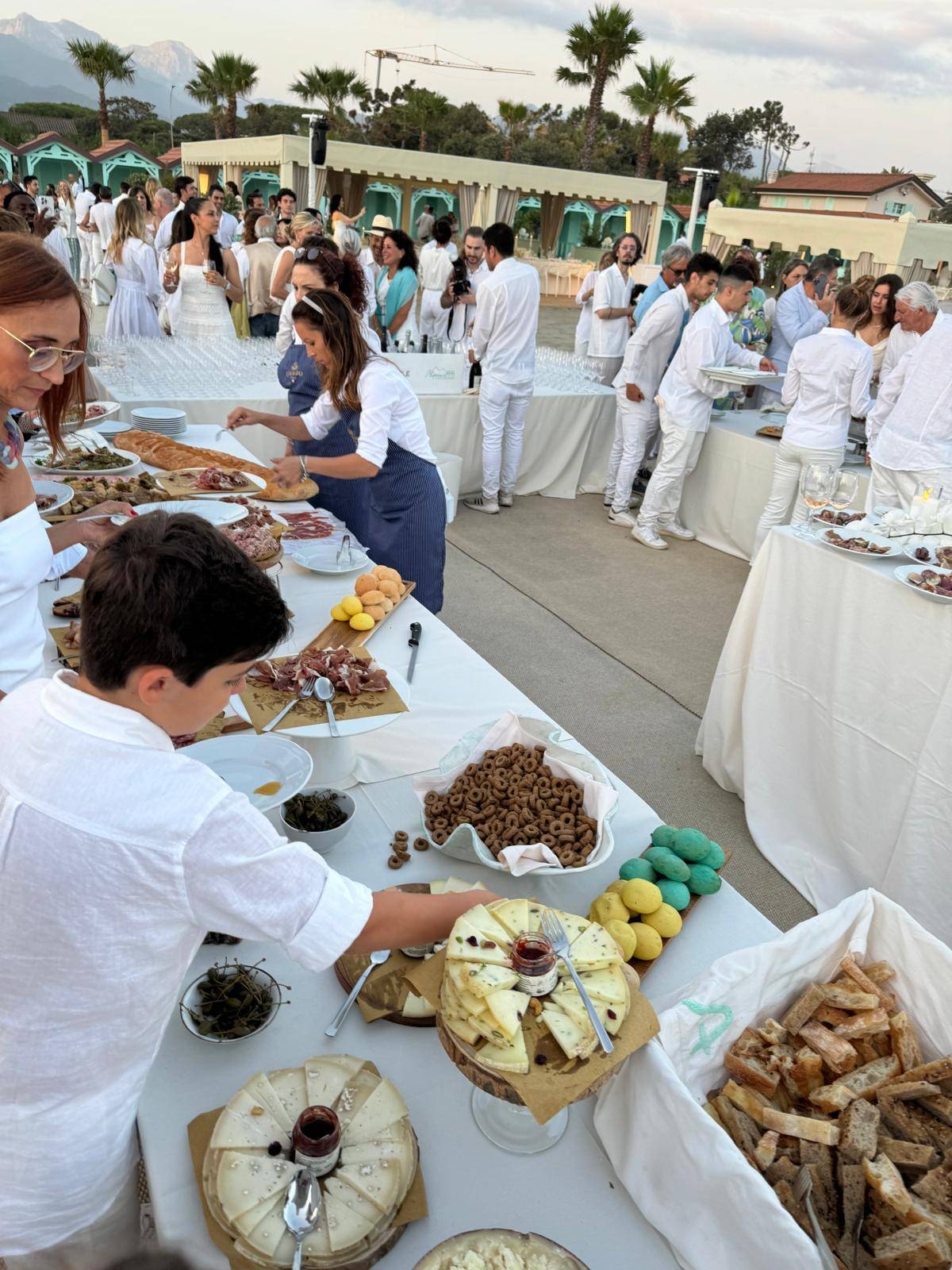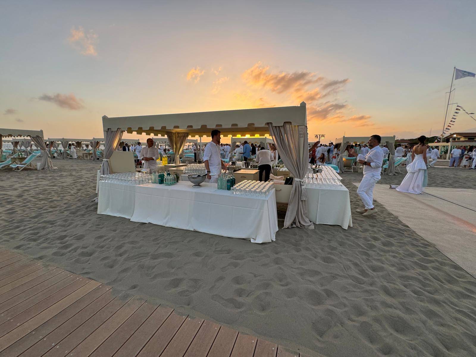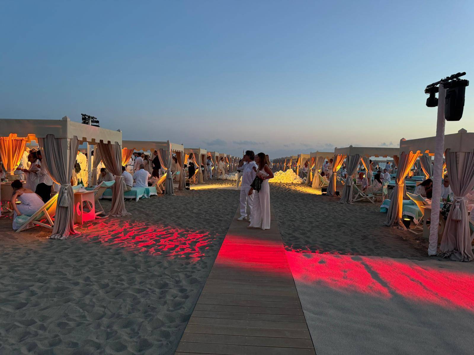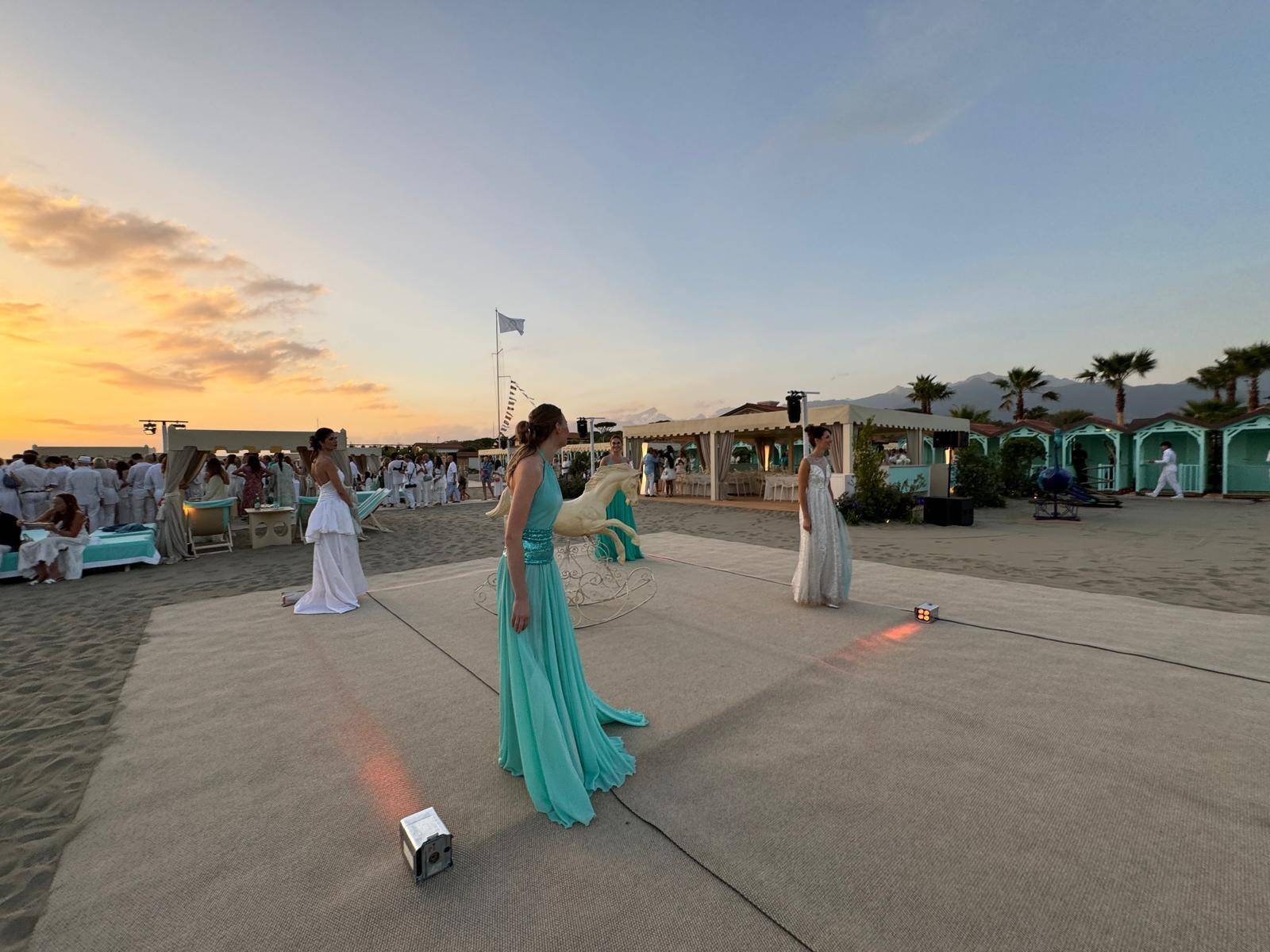 Immaginate la bellezza e l'eleganza, la raffinatezza e il buongusto, aggiungete un luogo dal fascino immutato nei secoli, versateci un fiume di rilassatezza e cortesia, mischiate un po' e provate a vedere che cosa esce fuori. E' un po' quello che veniva spontaneo provare a fare ieri sera sulla spiaggia di Forte dei Marmi accarezzata, finalmente, da un cielo limpido e celeste come non mai, nel cuore di un solstizio d'estate con tanto di luna piena sul fronte opposto ad un tramonto da favola. Da lasciare basiti. Una festa azzeccata in tutti i sensi, da quello meteo a quello enogastronomico passando per un dress code rigorosamente in bianco con un tocco di Alpemare che altri non è se non il verde Tiffany di audreyana memoria.
