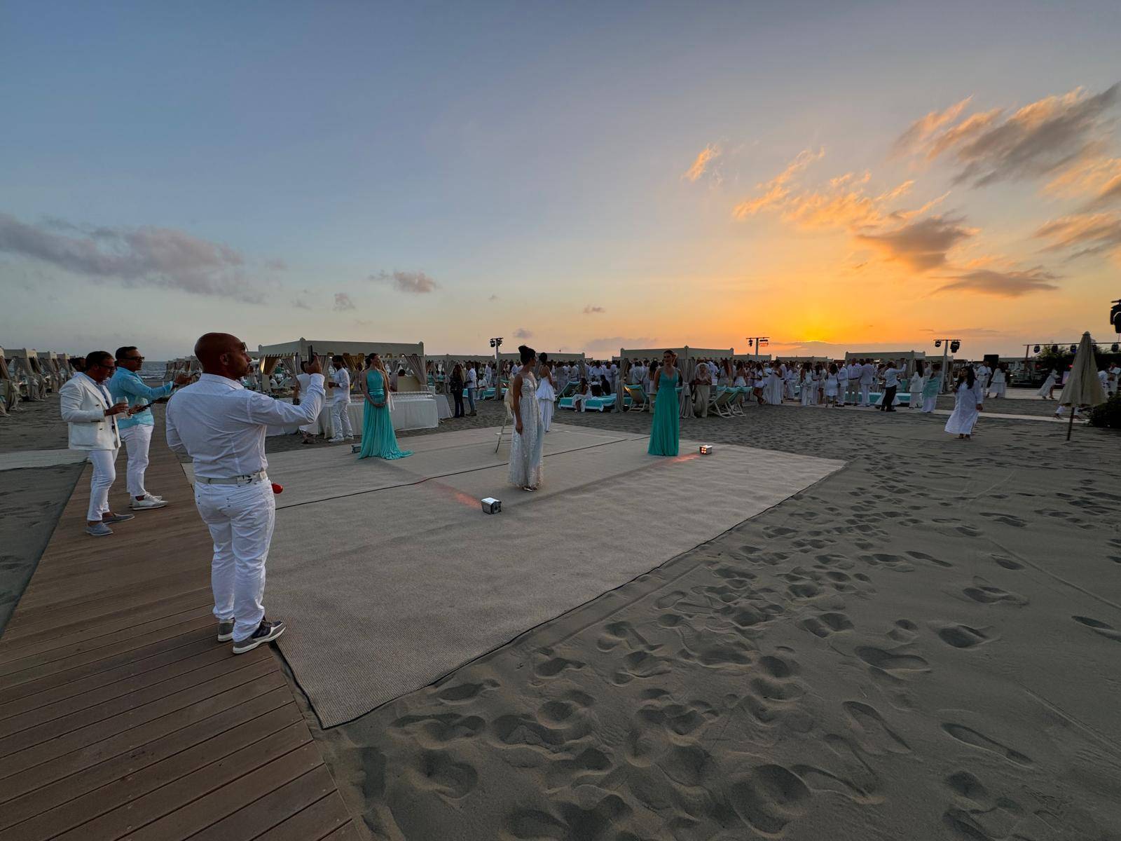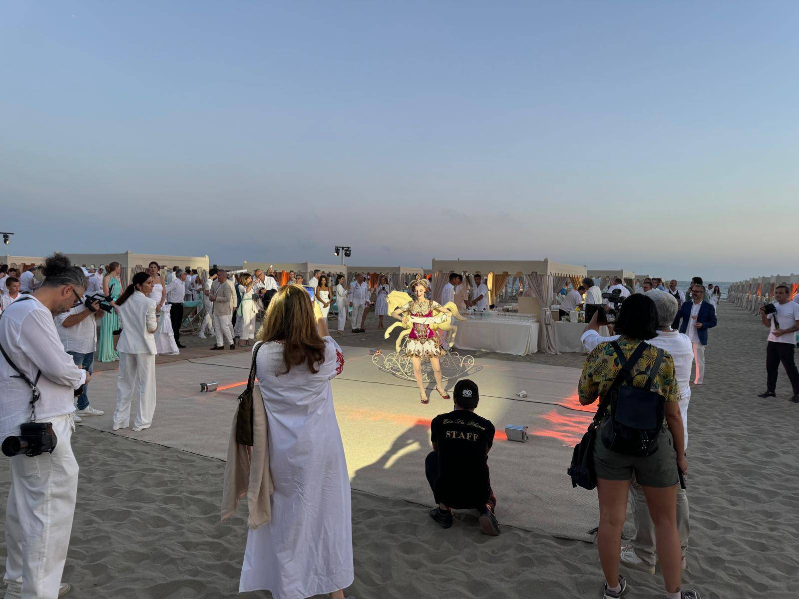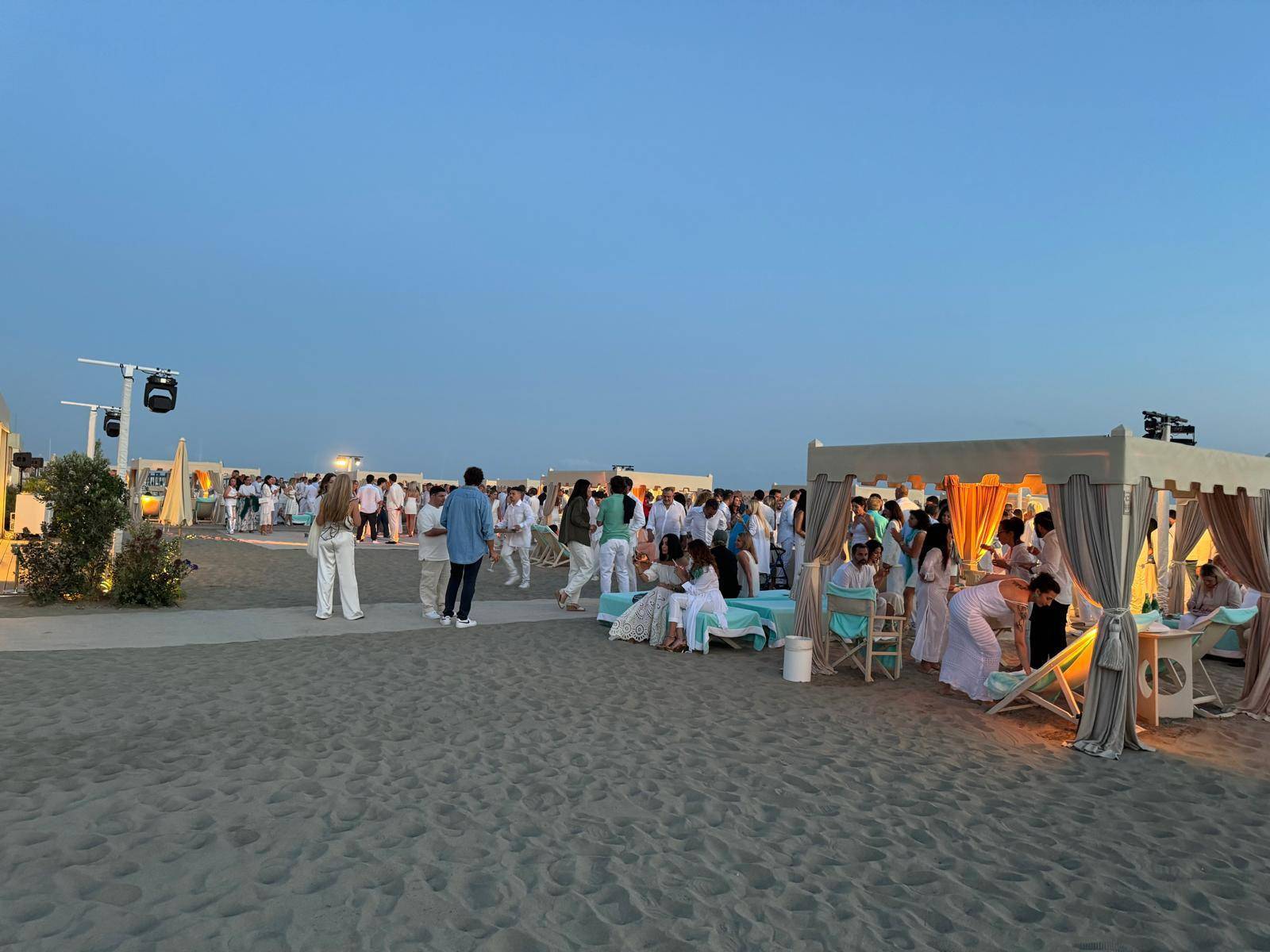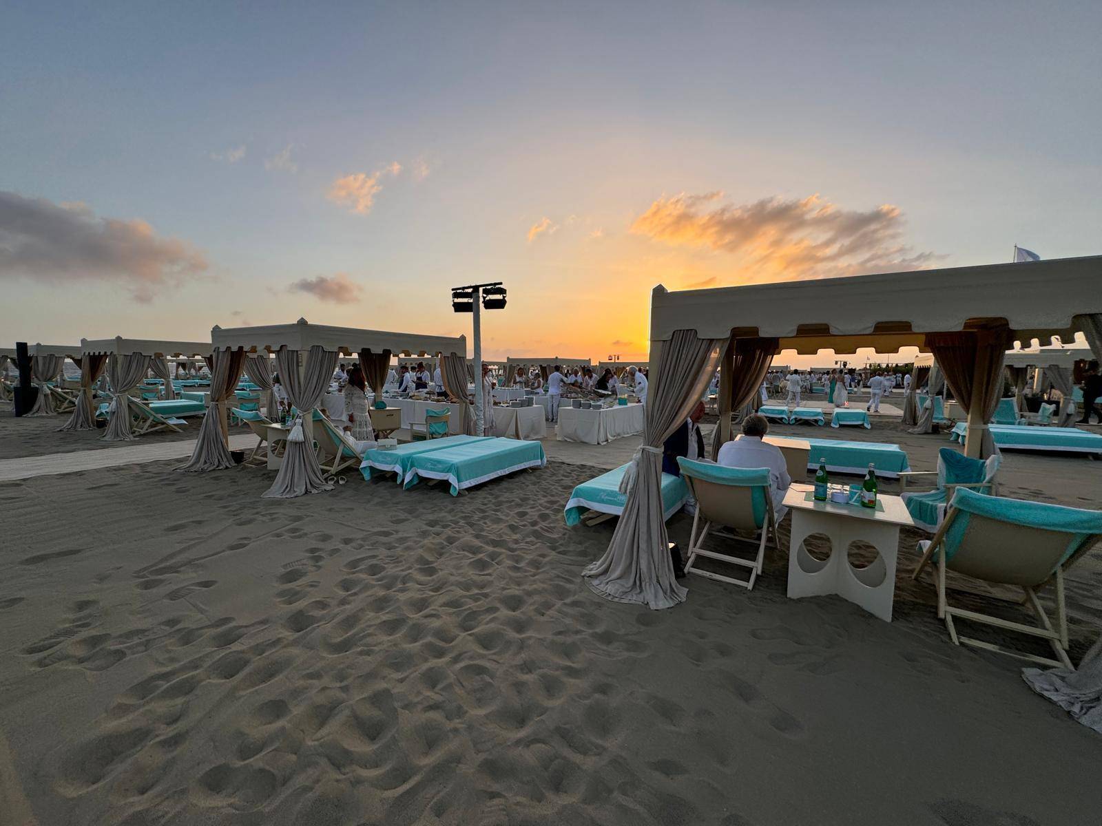 Immaginate la bellezza e l'eleganza, la raffinatezza e il buongusto, aggiungete un luogo dal fascino immutato nei secoli, versateci un fiume di rilassatezza e cortesia, mischiate un po' e provate a vedere che cosa esce fuori. E' un po' quello che veniva spontaneo provare a fare ieri sera sulla spiaggia di Forte dei Marmi accarezzata, finalmente, da un cielo limpido e celeste come non mai, nel cuore di un solstizio d'estate con tanto di luna piena sul fronte opposto ad un tramonto da favola. Da lasciare basiti. Una festa azzeccata in tutti i sensi, da quello meteo a quello enogastronomico passando per un dress code rigorosamente in bianco con un tocco di Alpemare che altri non è se non il verde Tiffany di audreyana memoria.