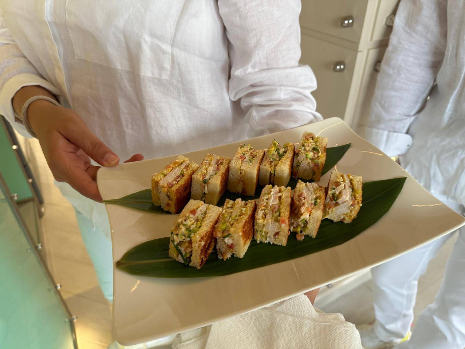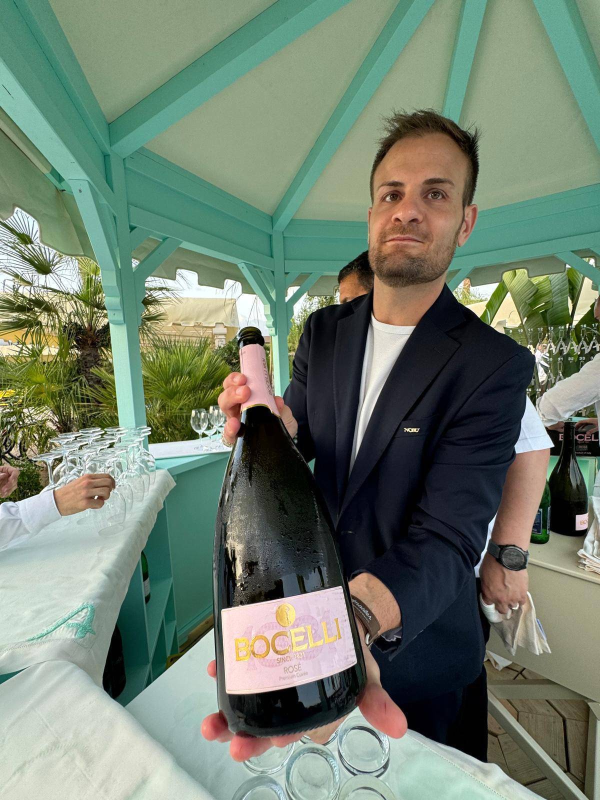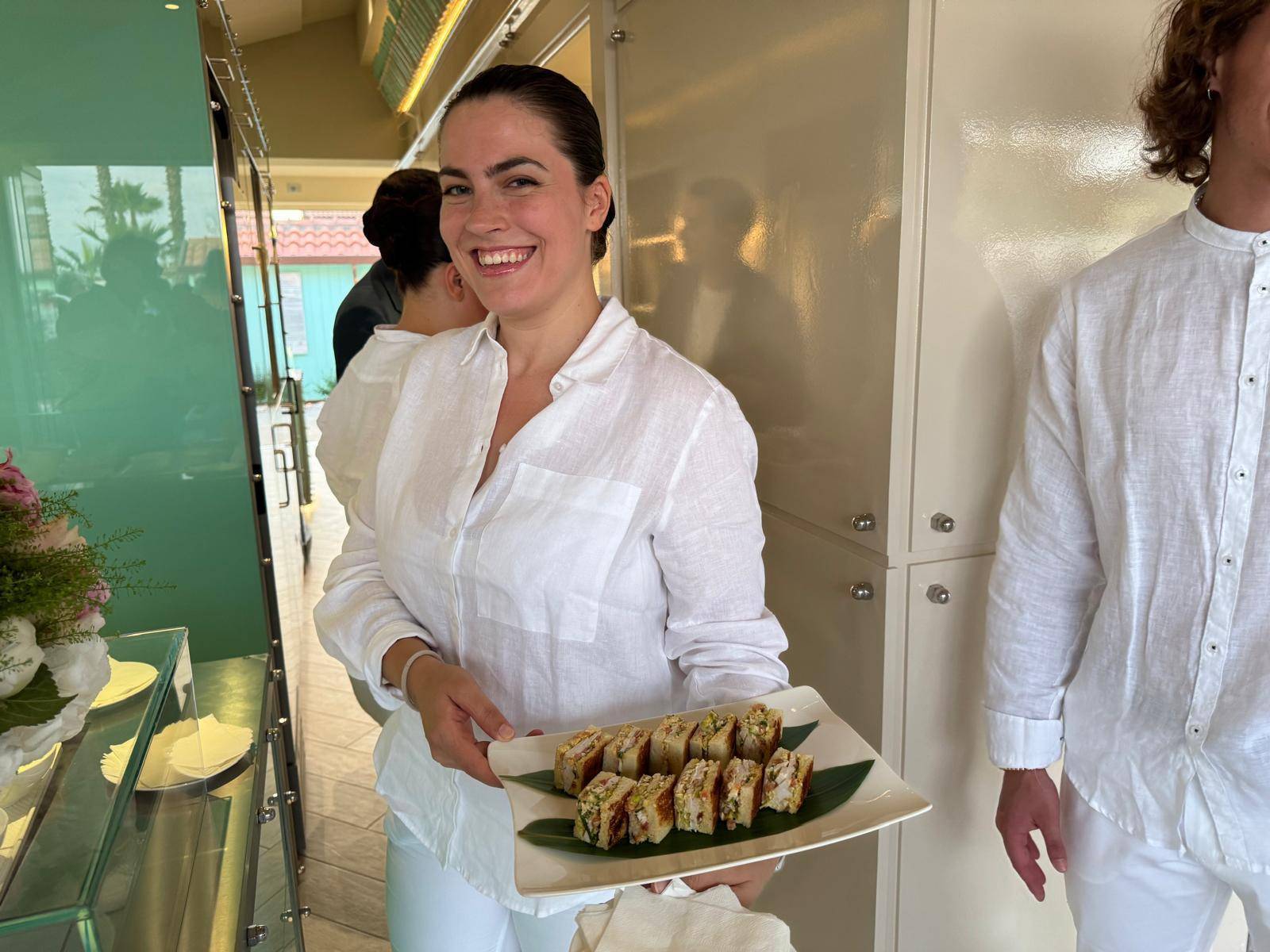 Hostess per il ricevimento meravigliose e con abiti di grandissimo gusto, personale efficiente ed efficace, un aperitivo all'insegna di ghiottonerie mignon come un bocconcino di tartare di manzo o i macarons al gorgonzola, ma, soprattutto, il sushi di Nobu, un prestigioso ristorante giapponese fondato da Nobu Matsuhisa, Robert De Niro e Meir Teper. Sushi roll usciti a pioggia, delicatissimi e appaganti, col tonno o con il salmone, con l'avocado o altro ancora e senza alcun limite di quantità. Il tutto annaffiato dal Bocelli Rosé Premium Cuvée, ottimo nettare proveniente dalle campagne venete.