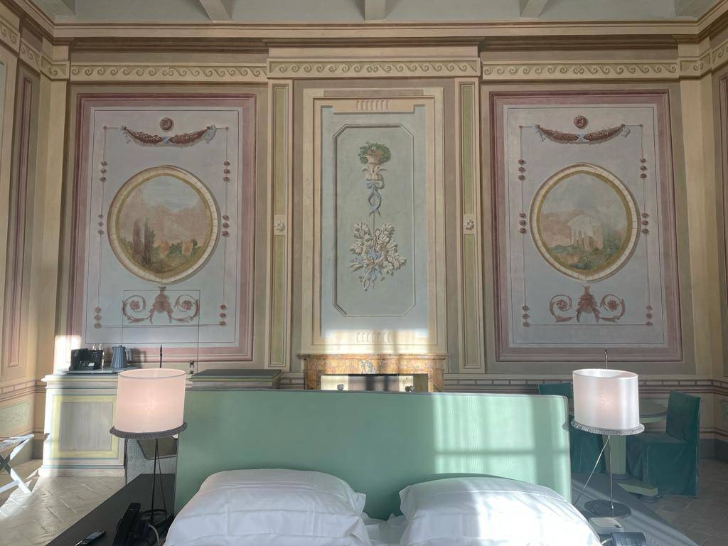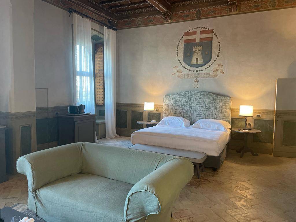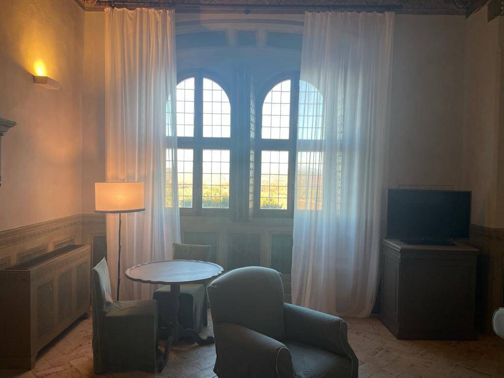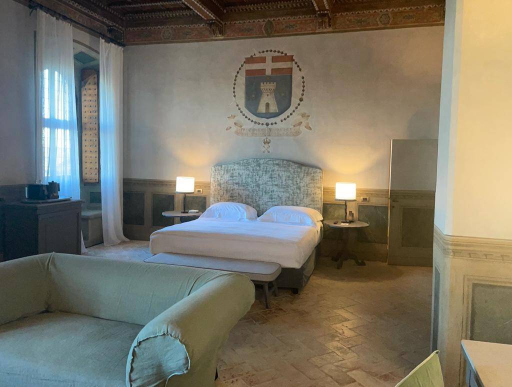 Le camere del castello non sono camere, ma veri e propri mini-appartamenti all'interno dei quali esiste un salottino dove rilassarsi con tanto di scrivania per eventuali necessità professionali, un bagno molto grande con vasca e doccia e anche due eleganti lavandini. Ampi spazi per rendere ogni sosta un piacere del corpo e dell'anima. In dotazione prodotti per il corpo decisamente di livello superiore. Il benvenuto è di qualità eccelsa: frutta di stagione, piccola pasticceria e una bottiglia di vino rosso in omaggio prodotto dall'azienda vinicola interna e dal valore notevolissimo.