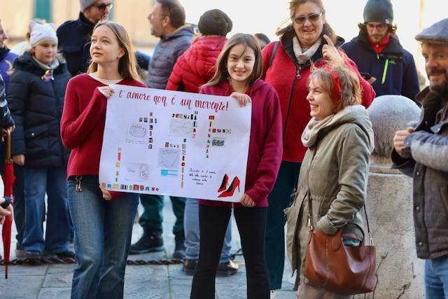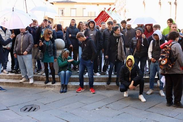 Poi è partito il flash mob che ha avuto inizio con una persona al centro di Piazza San Michele, seguita poi da altre persone fino all’inizio dell’abbraccio che, da piazza San Michele verso piazza Grande ha visto il corteo di tutti i partecipanti, con gli ombrelli rossi e bianchi aperti, intenti ed inesauribili nel fare più rumore possibile.