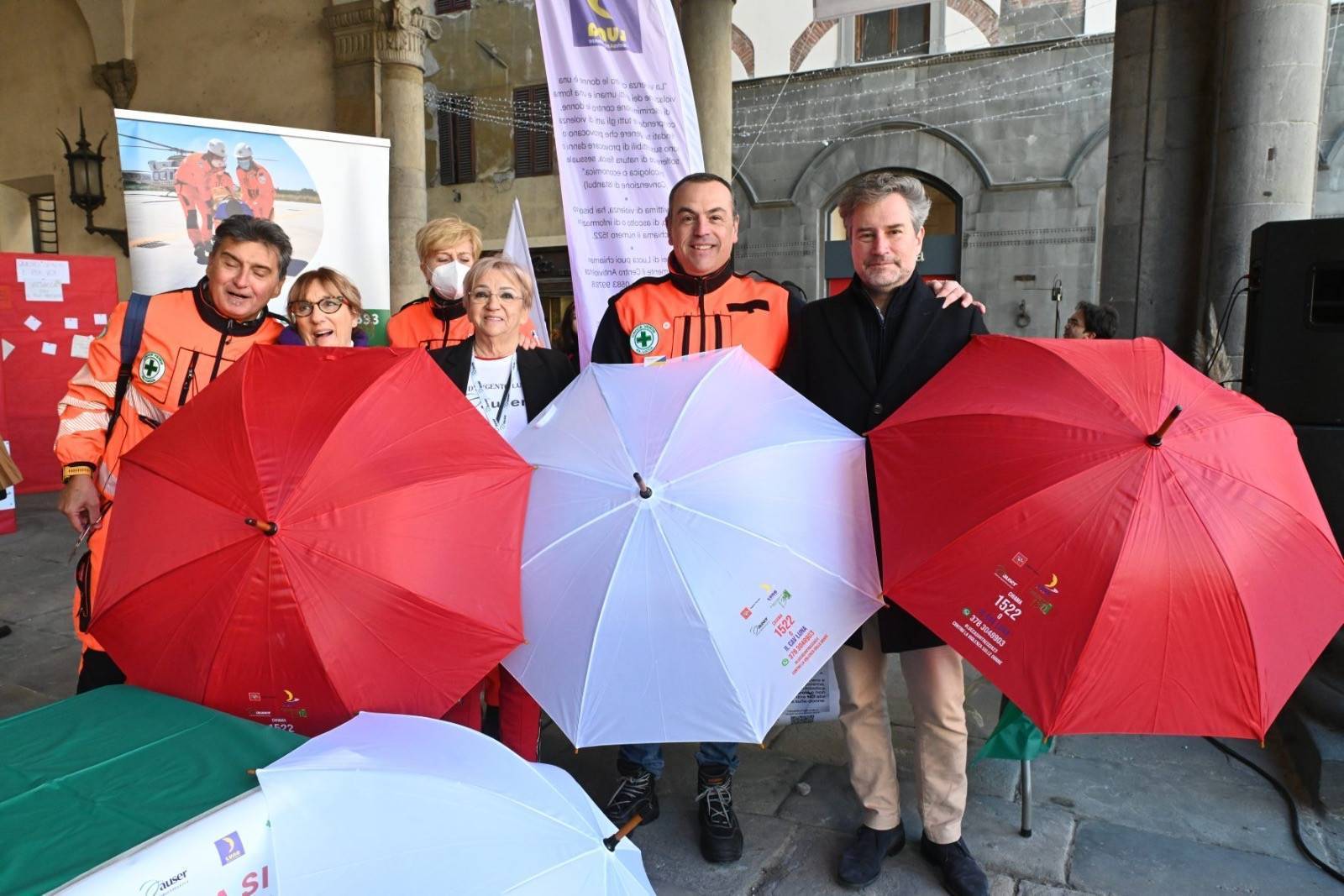 Oltre agli ombrelli rossi e bianchi, con il rosso simbolo del femminicidio e della violenza di genere ed il bianco che simboleggia l’impegno degli uomini a non tollerare e combattere la violenza di nessun tipo contro le donne, sono state distribuite anche le rose arancioni che sono un’icona internazionale. Piera Banti, responsabile del codice rosa per Lucca e Castelnuovo Garfagnana, ha così spiegato a La Gazzetta di Lucca: "La rosa arancione viene messa sulle divise degli operatori del pronto soccorso della nostra zona a dimostrazione che sono personale formato e sensibilizzato sulla violenza di genere. Questo simbolo è attivo da ben 12 anni”.