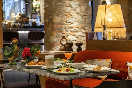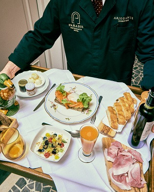 Parla molto di Alain e del suo gusto, della sua innata e spiccata passione per il Bello e il Buono, l’ambiente del Paradis Pietrasanta. A cominciare dal lounge bar Ariodante, che ha voluto chiamare così in onore del padre che portava il nome di un eroe dell’Orlando Furioso e poi di un’opera di Haendel: una bella sala con arredi in velluti Casamance e tavolini in ferro e bardiglio circondati da opere di grandi artisti, ecco Cesar e Folon, ecco Lorenzo Quinn e Ciulla. Qui, secondo i consigli del bar manager Gianluca Montanelli, si può prendere la piccola colazione, con il classico breakfast veloce all’italiana, caffè o cappuccino e croissant. Oppure optare per la carta del breakfast fornito al costo di 15 euro ai clienti dell’hotel e composto interamente da prodotti biologici: bevande, burro, confetture, pane del forno Lenzoni di Camaiore e focaccine fatte in casa, e in più uova strapazzate o fritte, bacon, taglieri di formaggi ovini e caprini. Nella sala lounge si può scegliere anche di pranzare, alla carta con piatti e proposte tradizionali, e non manca mai il pesce del giorno. La domenica si può optare per il brunch (disponibile ogni giorno) dalle 12h alle 15h, oppure per la formula “pranzo della domenica” (per il quale ci si sposta nella sala del ristorante), con scelta tra un menu di terra o di mare a 50 euro inclusi il coperto, l’acqua e il caffè, per dedicare un piacevole pit-stop gastronomico al tour fra i tesori di Pietrasanta. Dalle 15h alle 22h è disponibile una carta degli snack con focacce, tartine, hamburger e altre prelibatezze, ottime anche come aperitivo con vari amuse-bouche dalle 17h in poi, da assaporare insieme ai cocktail proposti in una carta stagionale tematica. Oltre alla lista dei gin e di classici distillati, si possono scegliere amari, bibite e caffetteria, le birre del Birrificio del Forte. Ci sono poi nove drink Signature composti da prodotti dell’agro-foresteria Paradis e di aziende locali. Da aggiungere che tutti i giorni dal lunedì al sabato è disponibile un menu del giorno per il pranzo a 32euro con antipasto, primo piatto e dolce, bevande escluse.