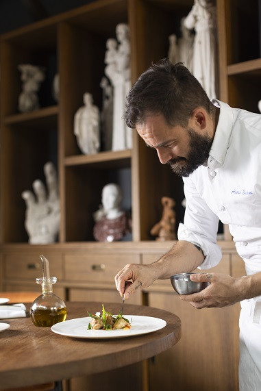 Era la sala d’armi dell’antica Rocca di Sala, la fortezza quattrocentesca, e per entrarvi si accede dal lounge bar oppure da uno stretto corridoio che si apre a cerchio in quello che fu il torrione delle mura cittadine che lambisce il giardino-aranceto in cui si può cenare al fresco dell’estate tra le opere di Bernard Bezzina. Prima del torrione, sulla sinistra, si apre un ambiente emozionante. Un museo: una gipsoteca ricca di calchi di opere famose, a cominciare dalla celebre statua dell’imperatore Ottaviano Augusto. Il bianco dei gessi si esalta nel contrasto con le pareti in pietra e i preziosi arredi in legno realizzati tutti a mano da un artigiano locale. Anche qui i tavoli sono in ferro con il piano in marmo bardiglio che, con agili sedie, si alternano a sedute-divano in velluto grigio Casamance. Una preziosa nicchia accoglie un bel tavolo tondo. La caratteristica volta a botte si esalta con il contrasto dei motivi neoclassici. I moderni sgabelli del bancone bar e le contro-travi in ferro che porgono l’illuminazione ai tavoli insieme alla mise en place di sobria eleganza (porcellane perlopiù bianche o in tinte tenui) rendono l’ambiente davvero accogliente che coccola già al primo impatto e annuncia quella che sarà una notevole esperienza gastronomica. I piatti dello chef Alessio Bachini, che porta la sua esperienza di lunghi anni in una cucina stellata, sanno al tempo stesso di freschezza e di tecnica, e alla massima freschezza attengono le materie prime, che provengono dal mare e dal Paradis Agricole con i suoi campi, i suoi orti, i suoi allevamenti. “Ogni giorno – si legge nella presentazione del menu – la nostra agroforesteria raccoglie e seleziona per noi verdure fresche e di stagione. Un percorso che prende vita dal Paradis Agricole e le porta direttamente dal seme al piatto, lasciandone inalterato il gusto naturale”. Insomma, un viaggio “pensato e ideato dallo chef per riscoprire i sapori autentici della natura”: poche righe per annunciare la filosofia di una carta intrigante, ma non ridondante di proposte, solo cinque per ogni referenza, come cinque sono le portate del menu degustazione, proposto a 70 euro più coperto e acqua, e del menu degustazione vegetariano allo stesso prezzo. Una carta che lo chef ha costruito, come rivela lui stesso, anche ripensando a ricordi antichi, alle tradizioni di casa, ai piatti tipici della cucina toscana preparati dalla nonna con le erbe che andavano a raccogliere insieme. Ecco gli amuse-bouche vegetariani, tutti dall’orto del Paradis Agricole, presentati in ciotole e piatti di legno o di marmo su un bel vassoio pure di legno: il raviolo fritto ripieno di verza e zenzero, la cecìna con burro aromatizzato, il cavolino di Bruxelles ripieno di maionese di capperi, il cestino di fieno con rosa di barbabietola, il cannolo di mais con crema di cavolfiore. Poi, via a un autentico carosello di sapori tra memorie di tradizione e raffinate creazioni: c’è la ricciola marinata con un gazpacho di frutta e verdure, carciofo e chips di topinambur; il pomodoro; le animelle di vitella sempre abbinate con frutta o verdura in consistenze e acidità diverse. Nel periodo invernale le lumache biologiche; la triglia con pinoli e finocchi; i tortelli di pollo con salsa cibreo; le pappardelle con coniglio dell’Azienda, mirtilli e erbe amare; i rigatoni con ricci di mare, calamaretti e rucola; mezzi paccheri con seppia e bieta; il coniglio alla cacciatora; l’uovo croccante che cambia sempre in base alle verdure di casa; il rombo con funghi porcini e patate. “Giusto in questo periodo – dice Alessio Bachini – stiamo lavorando sulla frollatura del pesce, dove ne è un chiaro esempio la triglia. Dopotutto perché frollare solo le carni? Molti pensano che il pesce più buono sia quello appena pescato. Invece, frollandolo il pesce acquisisce sapore, morso e consistenze diverse da quelle a cui siamo abituati. Chiaramente, ogni tipo di pesce ha la propria tempistica proprio come la carne”. Nei dessert da ricordare: tentazione al cioccolato; brioche con marmellata di albicocche, zenzero e rosmarino; robiola e fichi; millefoglie alla vaniglia, latte di capra e arancio; castagne e pere. La filosofia del ristorante è: scarto zero, il cosiddetto zero waste. La brigata tutta lavora la materia prima dalla a alla z. Dalla cipolla, dove viene usata ogni sua parte, quella tenera all’interno fino alle foglie esterne e la buccia, alla seppia dove con la polpa viene mantecata la pasta, con i tentacoli e l’osso interno viene fatto il jus mentre con le interiora viene creata una salsa adagiata poi sopra. Eventuali scarti obbligati vengono usati come mangime per gli animali presenti a Paradis Agricole. In tutte le proposte del menù, la verdura o la frutta oltre che essere a km 0 e, ovviamente stagionali, hanno un ruolo fondamentale; non sono soltanto un accompagnamento ma servono ad equilibrare il piatto stesso con acidità, freschezza e aromaticità diverse.