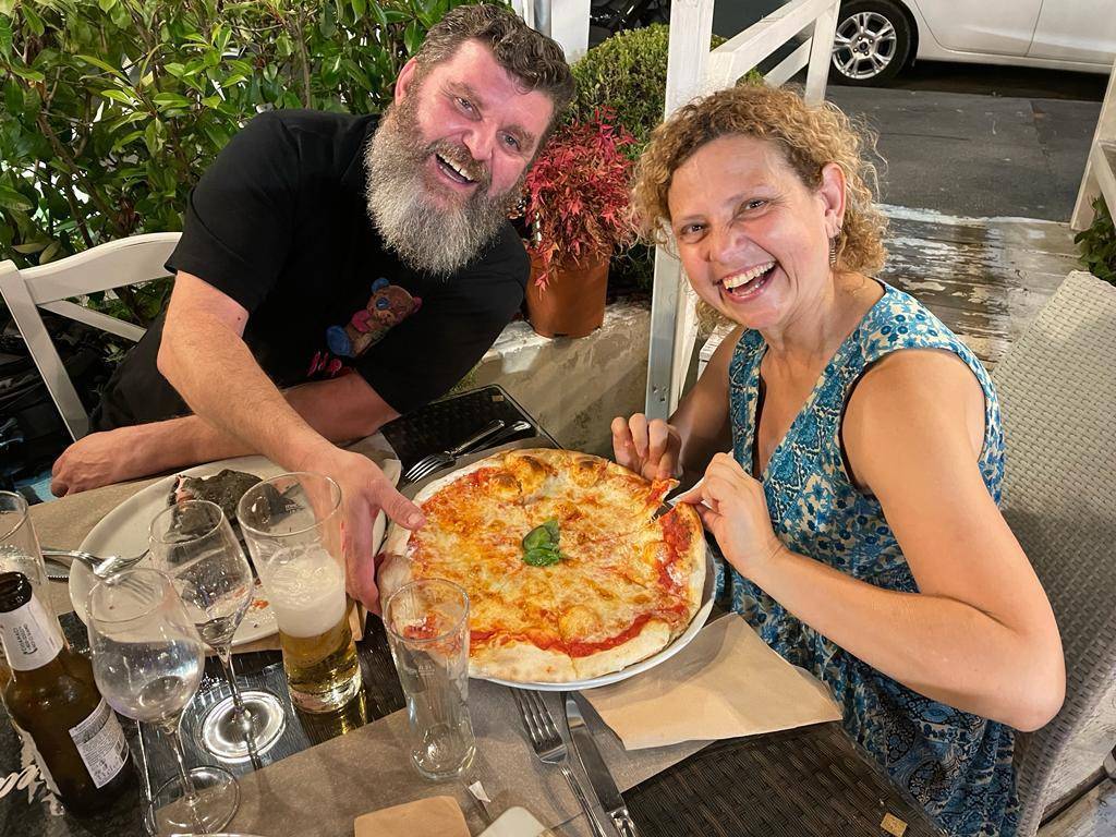 Queste pizze preparate da Andrea che Sabina magnifica fino all'inverosimile, non sono niente male, una in particolare ci colpisce, con mozzarella, gamberi e zucchine. Sottile come piace a noi e a tutti, cotta al punto giusto senza sbavature. E' previsto anche un assaggio di tordelli lucchesi che, dice la proprietaria innamorata persa delle Gazzette che la seguono dall'inizio della sua avventura, sono molto buoni. La conferma arriverà, successivamente, proprio da Marco Materassi, ex direttore di banca che con il formalismo delle banche e dei bachieri oltreché dei bancari, non ha mai avuto granché a vedere. A proposito, dopo qualche forfait è venuto anche Gabriele Muratori, lo specialista della cronaca nera, quello che quando succede qualcosa diviene il nostro bersaglio preferito di richieste e informazioni. E' un vignettista superlativo e lo ha dimostrato più volte, ironico, parla poco se non quando gli pare, di compagnia. A lui si devono numerosi 'buchi', soprattutto notturni, agli altri giornali. Non è assiduo, ma c'è sempre e questo lo rende impagabile.