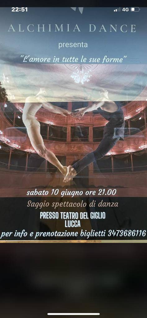 Grandissimo evento di danza sportiva al teatro del Giglio, sabato 10 giugno alle ore 21 si svolgerà il saggio spettacolo “L’amore in tutte le sue forme” della scuola Alchimia Dance di Lucca, dei direttori artistici e tecnici Luca Alfani e Chiara Bellegoni. Si esibiranno sul palco ben oltre 160 atleti, tra cui pluri campioni italiani e finalisti ai campionati assoluti e finaliste a numerosi concorsi di danza, in uno spettacolo veramente emozionante e pieno di amore per la danza, si esibiranno diverse discipline dalle Danze Standard e Latine alle Danze Caraibiche, dalle Danze Accademiche come Modern e Danza Classica alle Danze Ottocentesche passando per Break Dance, Tango Argentino e molto altro.