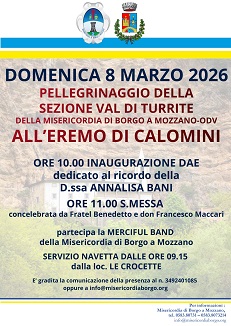 A seguire, alle 11, Fratel Benedetto e Don Francesco Maccari, Correttore della Confraternita, concelebreranno la Santa Messa. Presterà servizio la Merciful Band, la banda musicale della Misericordia borghigiana. L’invito a partecipare è esteso comunque a soci e volontari, non solo della Sezione, ma di tutta la Confraternita borghigiana. E’ previsto un servizio navetta a partire dalle 9:15 da località Le Crocette. È gradita la comunicazione della presenza al n° 349/2401085 oppure a