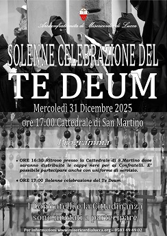 Mercoledì 31 dicembre 2025 alle ore 17 avrà luogo la Solenne celebrazione del Te Deum nella Cattedrale di San Martino, alla quale sono invitati a prendere parte i Confratelli e le Consorelle della Misericordia.