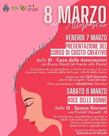 Sabato 8 marzo, dalle 15 allo Spazio Giovani di via Fratelli Rosselli 18, si terrà "Voce delle Donne", un evento inserito nel progetto "Educativa di Strada - Giovani al Centro". L'iniziativa vuole sensibilizzare i giovani e la comunità sul tema dei diritti delle donne, offrendo uno spazio libero di discussione sull'uguaglianza, le pari opportunità e l'importanza delle conquiste femminili nel corso della storia. Dopo una prima chiacchierata, l'evento si sposterà nel centro di Altopascio, dove i ragazzi potranno confrontarsi direttamente con i cittadini, facendo loro domande, scambiando pensiero e raccogliendo opinioni, testimonianze e storie legata a ciò che rappresenta oggi la Giornata internazionale dei diritti delle donne.