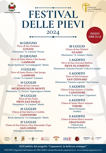 Di seguito il programma del Festival delle Pievi 2024 (inizio concerti ore 21.15): domenica 16 giugno Pieve di San Frediano, Lunata -Filarmonica ‘A. Catalani’ Porcari; sabato 22 giugno Pieve di Santa Maria e San Jacopo, Lammari- Banda Spettacolo ‘La Campagnola’ Marlia; venerdì 5 luglio Pieve di Santa Maria e San Jacopo, Lammari- Corale ‘A. Catalani’ Lammari; sabato 13 luglio Pieve di San Lorenzo, Segromigno in Monte - Filarmonica ‘G. Puccini’ Segromigno in Monte; venerdì 19 luglio, Pieve di San Paolo, Pieve San Paolo - Filarmonica ‘A. Catalani’, Marlia; domenica 21 luglio Chiesa di San Quirico e Giulitta, Capannori - Banda Spettacolo ‘La Campagnola’ Marlia; sabato 27 luglio Chiesa di San Ginese e San Alessandro Papa, San Ginese- ‘Francigena Chamber Orchestra; domenica 28 luglio Chiesa di San Michele, Guamo Filarmonica ‘A. Catalani’ Marlia; giovedì 1 agosto Pieve di San Giovanni Battista, Pieve di Compito Filarmonica ‘Giacomo Puccini’ Colle di Compito; venerdì 2 agosto Pieve di San Gennaro, San Gennaro Filarmonica ‘Gaetano Luporini’ San Gennaro; sabato 3 agosto Chiesa di San Quirico e Giulitta, Capannori- Musica Sacra ‘Coro Capata’ Capannori; martedì 6 agosto Chiesa di Santa Maria Assunta, Tofori Marco Fornaciari (violino); venerdì 9 agosto, Chiesa di Santa Maria Assunta, Gragnano - I Maestri del Francigena Festival.