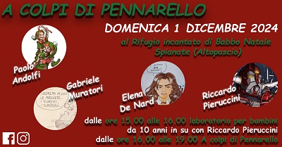 La seconda parte, dalle ore 16.00 alle ore 19.00, vedrà i disegnatori di A colpi di Pennarello Paolo Andolfi, Elena De Nard, Gabriele Muratori e Riccardo Pieruccini disegnare gomito a gomito. Chi assisterà alla performance potrà chiedere agli artisti di realizzare un disegno autografo da tenere come ricordo, o da regalare, su un tema che preferisce, oppure semplicemente vederne la creazione. La scelta resta a chi sarà presente.