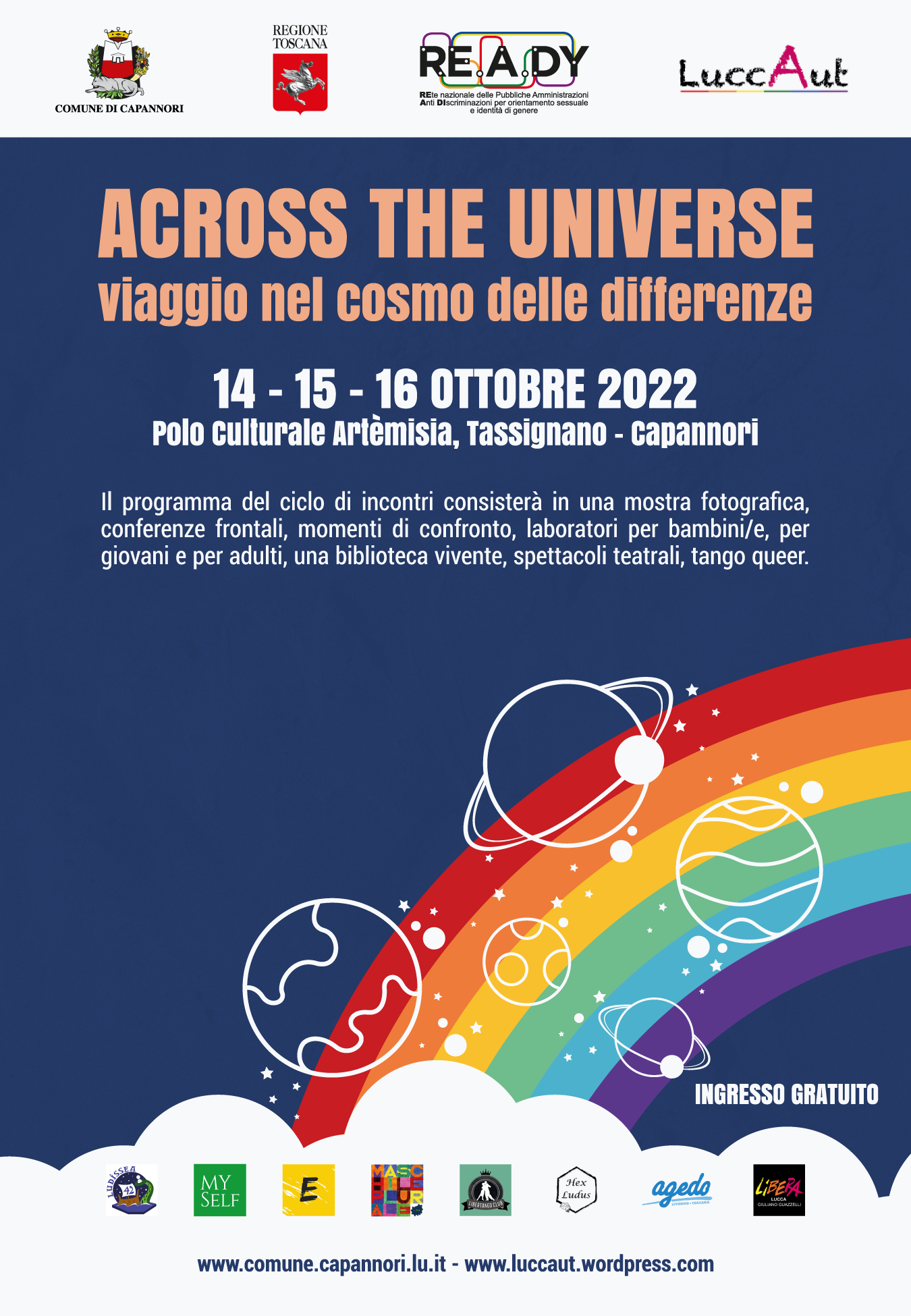 Ore 17:00: apertura del ciclo di incontri "Across the Universe: viaggio nel cosmo delle differenze" a cura di LuccAut, Comune di Capannori e presentazione delle realtà coinvolte.