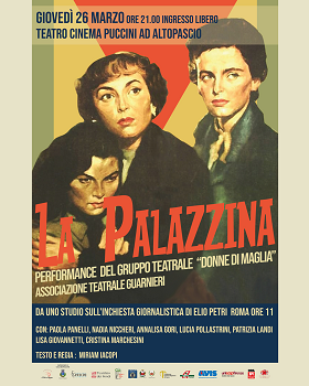 "Cosa succederebbe se centinaia di donne si affollassero oggi per un solo, misero, posto di lavoro? La precarietà non è una novità: è una storia lunga troppi anni." Da questa domanda nasce "La Palazzina", lo spettacolo teatrale ispirato al film "Roma ore 11", in scena giovedì 26 marzo, alle 21, al Teatro Cinema Puccini di Altopascio.