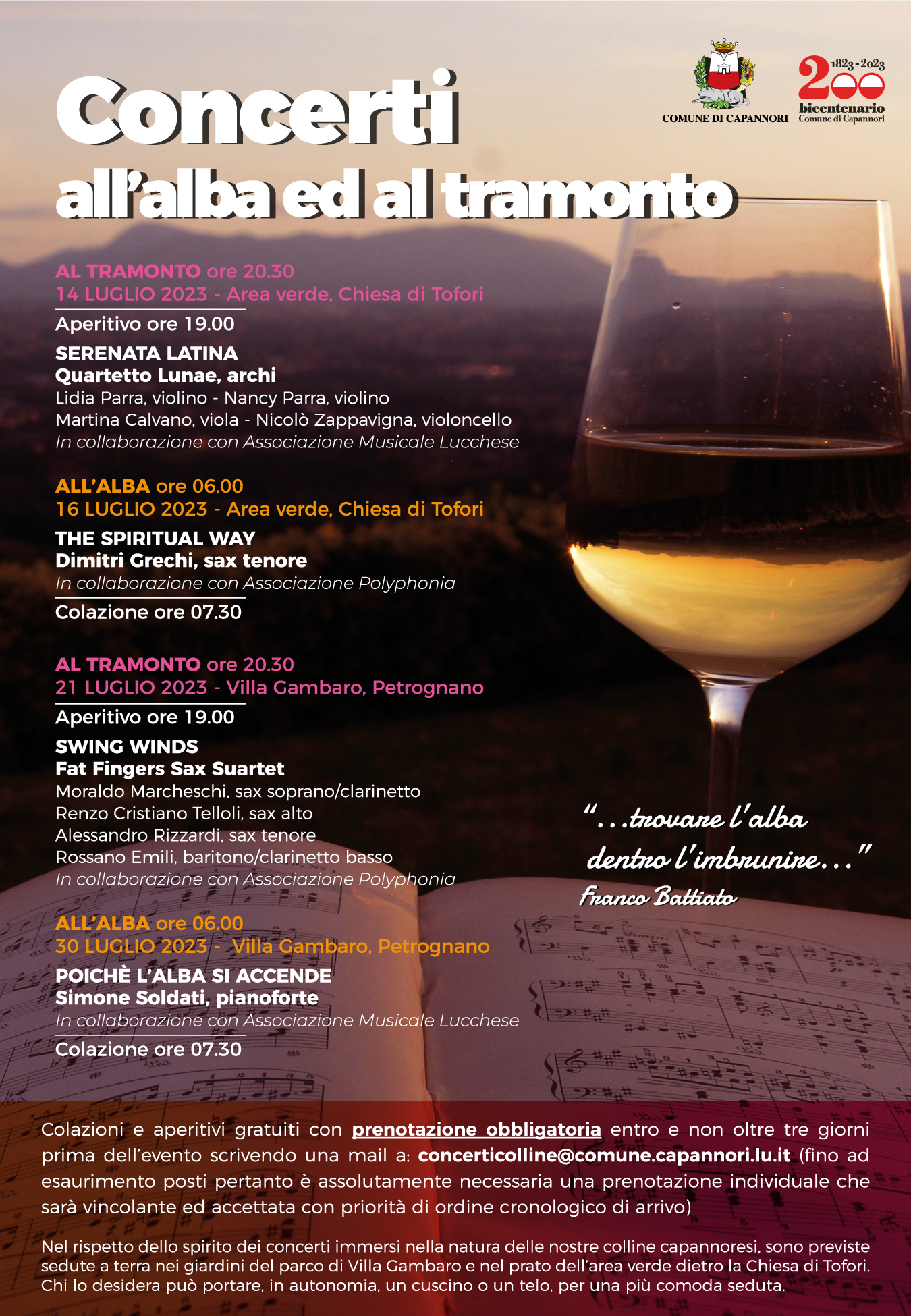 Il programma dei Concerti all'alba ed al tramonto: 'Concerto al tramonto' venerdì 14 luglio ore 20.30, area verde, chiesa di Tofori. Aperitivo ore 19. 'Serenata Latina'- Quartetto Lunae, archi: Lidia Parra (violino), Nancy Parra (violino), Martina Calvano, (viola), Nicolò Zappavigna (violoncello). In collaborazione con Associazione Musicale Lucchese; 'Concerto all'alba' domenica 16 luglio ore 6.00, area verde, chiesa di Tofori. Colazione ore 7.30. 'The Spiritual Way'- Dimitri Grechi, sax tenore. In collaborazione con Associazione Polyphonia; 'Concerto al tramonto' venerdì 21 luglio ore 20.30 Villa Gambaro, Petrognano. Aperitivo ore 19. 'Swing Winds'- Fat Fingers Sax Suartet: Moraldo Marcheschi (sax soprano, clarinetto), Renzo Cristiano Telloli (sax alto), Alessandro Rizzardi (sax tenore), Rossano Emili (baritono, clarinetto basso). In collaborazione con associazione Polyphonia. 'Concerto all'alba' domenica 30 luglio ore 6.00, Villa Gambaro, Petrognano. Colazione ore 7.30. 'Poichè l'alba si accende'- Simone Soldati, pianoforte. In collaborazione con Associazione Musicale Lucchese.