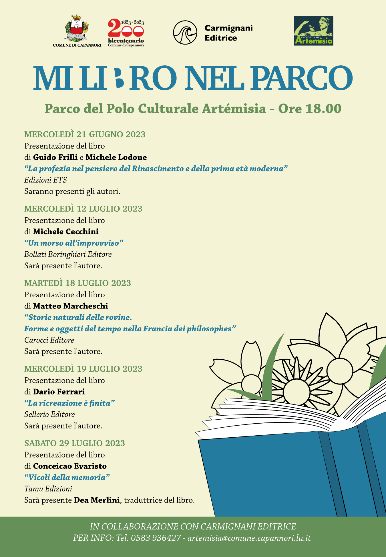 Prenderà il via mercoledì 21 giugno, alle ore 18, nel parco del polo culturale Artèmisia di Tassignano la terza edizione della rassegna letteraria 'Mi libro nel parco' promossa dal Comune in collaborazione con Carmignani Editrice. Cinque gli appuntamenti in programma per questo nuovo ciclo di incontri letterari.