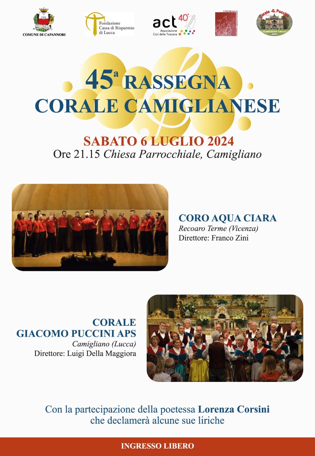 Sabato 6 luglio la chiesa parrocchiale di Camigliano ospiterà, a partire dalle ore 21.15, la ‘45a edizione della ‘Rassegna Corale Camiglianese’ organizzata dalla locale corale ''Giacomo Puccini'' con il contributo del Comune di Capannori e della Fondazione Cassa di Risparmio di Lucca. Ospite della serata sarà il Coro ‘Aqua Ciara’ di Recoaro Terme (Vicenza) diretto da Franco Zini.