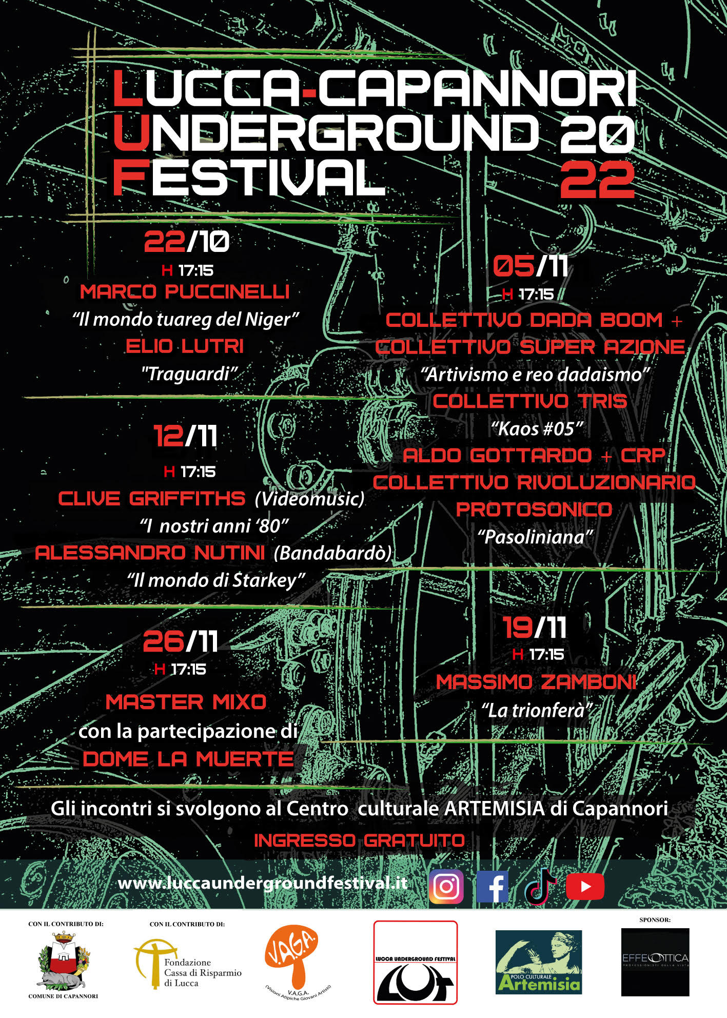 Il 'Lucca Capannori Underground Festival 2022' è organizzato da V.A.G.A. (Visioni Atipiche Giovani Artisti) con il contributo del Comune di Capannori e della Fondazione Cassa di Risparmio di Lucca e vede sponsor Effeottica Lucca.