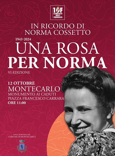 Si svolgerà sabato 12 ottobre 2024, alle ore 11, in piazza Francesco Carrara, nel centro storico di Montecarlo (LU), "Una rosa per Norma Cossetto", la manifestazione promossa in tutta Italia dal Comitato 10 Febbraio e giunta alla sesta edizione, che intende onorare la memoria della giovane studentessa istriana, seviziata e uccisa nel 1943 dai partigiani di Tito. L'evento ha ottenuto il patrocinio gratuito dell'amministrazione comunale di Montecarlo e sono stati invitati a presenziare il Sindaco, l'Assessore alla Cultura, i Consiglieri Comunali, le associazioni locali e l'intera cittadinanza.
