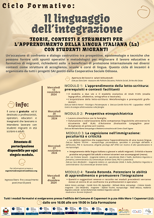 Migliorare l'insegnamento agli stranieri della lingua italiana. E' questo l'obiettivo dei 4 incontri formativi "Il linguaggio dell'integrazione. Teorie, contesti e strumenti per l'apprendimento della lingua italiana (L2) con studenti migranti" , organizzati dalla cooperativa Sociale Odissea (Consorzio CO&SO) e frutto della collaborazione degli 8 progetti Sai-Sitema Accoglienza Integrazione. Gli eventi, dal 13 novembre al 4 dicembre, saranno gratuiti e aperti alla cittadinanza, a operatori professionisti, educatori e insegnanti che lavorano con studenti migranti, richiedenti asilo e beneficiari di protezione internazionale di ogni età.