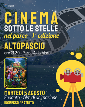 È il parco Aldo Moro lo spazio scelto dall'amministrazione comunale per l'appuntamento altopascese del cinema itinerante sul territorio. La programmazione è per martedì 5 agosto, alle 21.30, al parco Moro, con "Encanto", il film di animazione proposto dal Cineforum Zero in condotta: l'ingresso è gratuito.