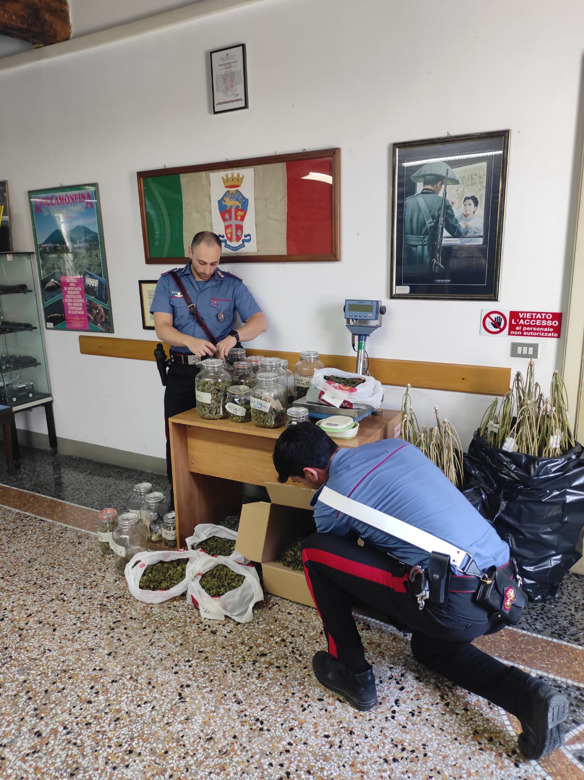 I militari dell’Arma, che seguivano i movimenti della coppia già da diversi giorni, ieri mattina, durante un servizio di osservazione nei pressi della loro abitazione, hanno sentito un forte odore di cannabinoidi provenire proprio da quella casa. Considerata la situazione, hanno deciso di procedere ad una perquisizione domiciliare, nel corso della quale sono stati rinvenuti: 35 piante di cannabis indica in fase di essiccazione del peso complessivo di circa 3,6 Kg.; 16 barattoli in vetro contenenti complessivamente circa 1,5Kg. di marijuana; 5 buste in cellophane contenenti circa 1,8 Kg. di marijuana; una bilancia; due ventilatori ed un condotto di areazione; 60 vasi di plastica e materiale per la coltivazione.