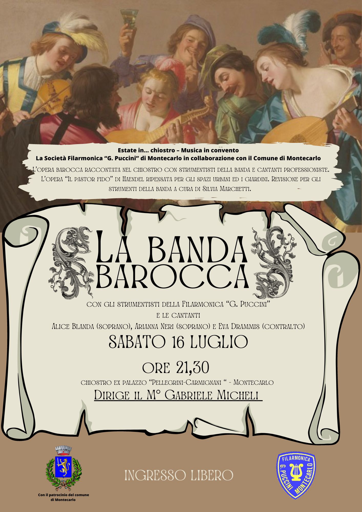 Nell'ambito della rassegna "Estate in... chiostro - musica in convento", sabato 16 luglio alle ore 21,30 nel chiostro dell'ex Istituto Pellegrini- Carmignani, via Roma, 3 a Montecarlo, la Filarmonica "G. Puccini" di Montecarlo propone al pubblico il concerto "La banda barocca", l'opera barocca raccontata in giardino con strumentisti della banda e cantanti professionisti. L'opera "Il pastor fido" di Haendel ripensata per gli spazi urbani ed i giardini. Revisione per gli strumenti della banda a cura di Silvia Marchetti.